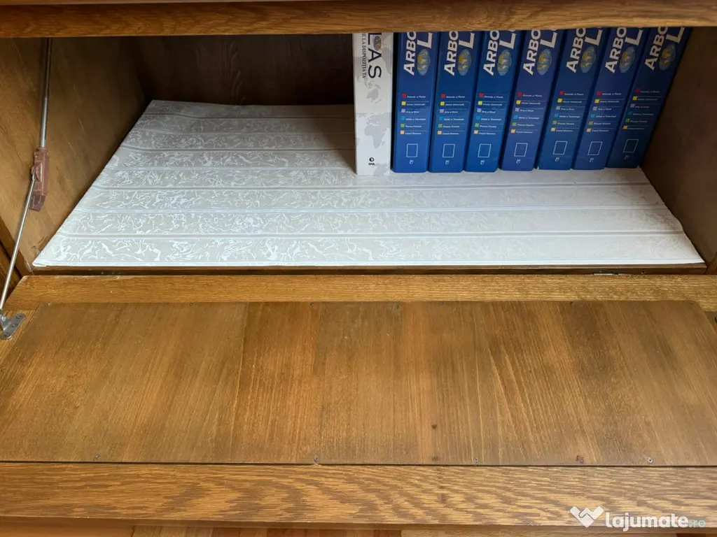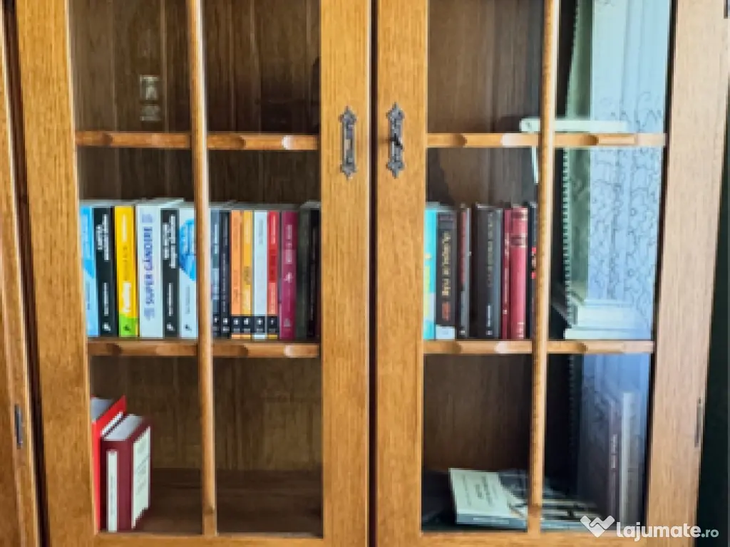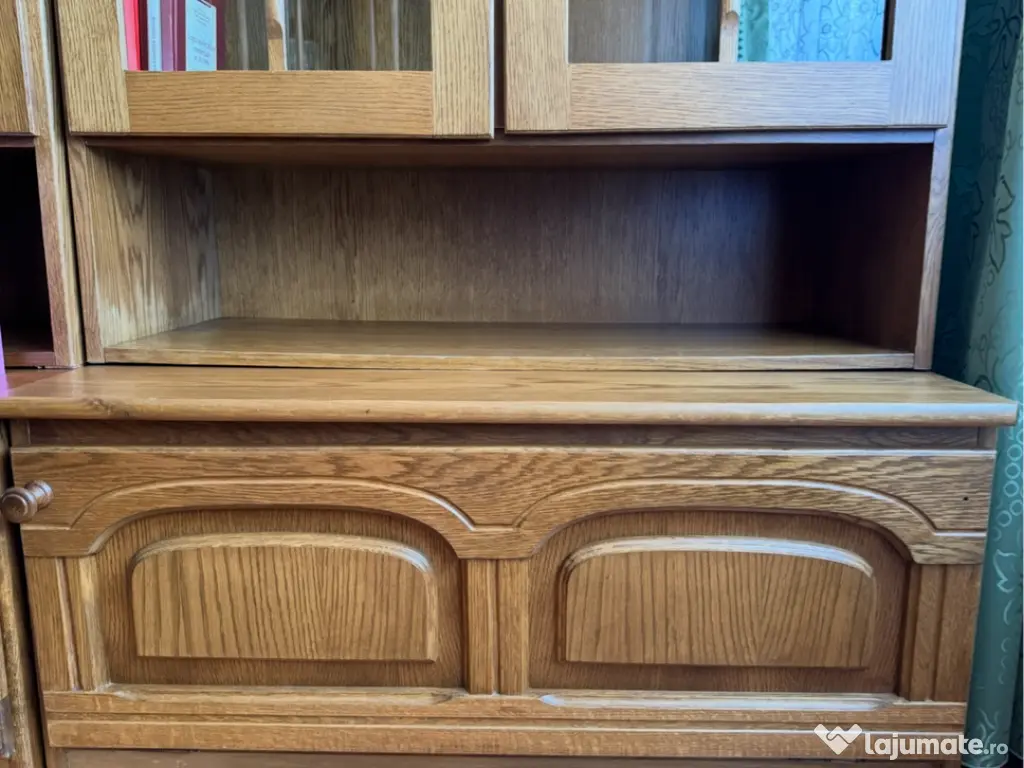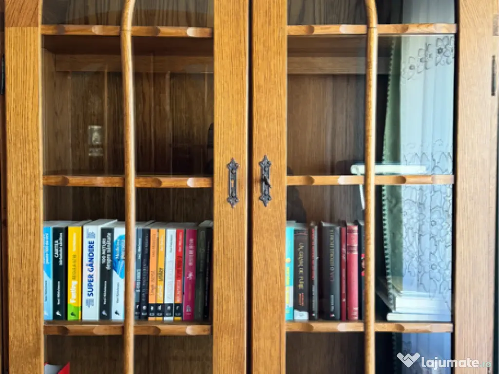 Mobilă de bibliotecă din lemn de stejar cu design clasic și arcuri în formă de semicerc. Poate fi folosită pentru a expune și depozita cărți sau alte obiecte decorative. Mobilierul este în stare bună și poate fi o adăugare elegantă în orice spațiu de living sau birou.