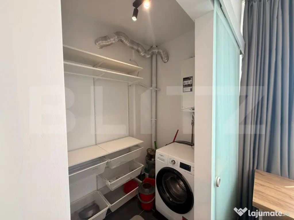 Apartamentul este compartimentat practic, având un living primitor cu bucătărie open-space, complet mobilată și utilată, inclusiv mașină de spălat vase, un dormitor confortabil, o baie modernă și un spațiu de depozitare cu acces din dormitor, ce poate fi amenajat cu ușurință ca dressing.