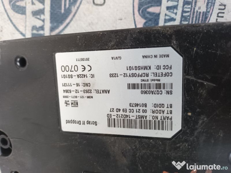 Modul bluetooth Ford C-MAX. Cod(uri): AM5T14D212ED. Piesele comercializate sunt originale, provenite din dezmembrari. Dispunem de o gama larga de piese multimarca. Piesele sunt verificate inainte de a fi puse spre vanzare. In caz de neconformitate piesa se poate returna. Va rugam sa verificati disponibilitatea pieselor telefonic. Trimitem in tara prin curier.