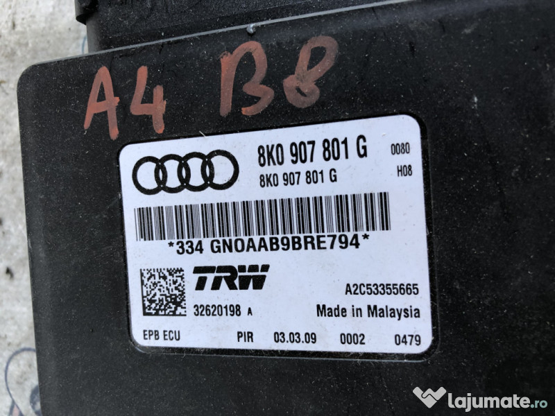 Modul frana de mana Audi A4 B8 2010. Cod(uri): 8K0907801G. Piesele comercializate sunt originale, provenite din dezmembrari. Dispunem de o gama larga de piese multimarca. Piesele sunt verificate inainte de a fi puse spre vanzare. In caz de neconformitate piesa se poate returna. Va rugam sa verificati disponibilitatea pieselor telefonic. Trimitem in tara prin curier. Marcă: Audi Producător: Audi