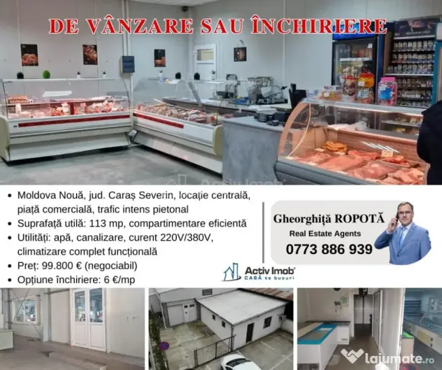 Suprafata Utila: 113 mp, compartimentata eficient, cu multiple incaperi, fiind potrivita pentru diverse activitati comerciale, in special pentru prelucrarea si conservarea carnii.