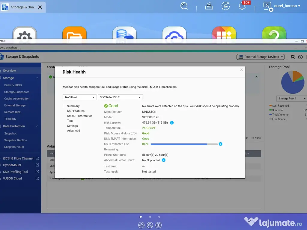 Bonus inclus: SSD SATA 512GB cu 84% remaining life (conform QTS Storage & Snapshots).