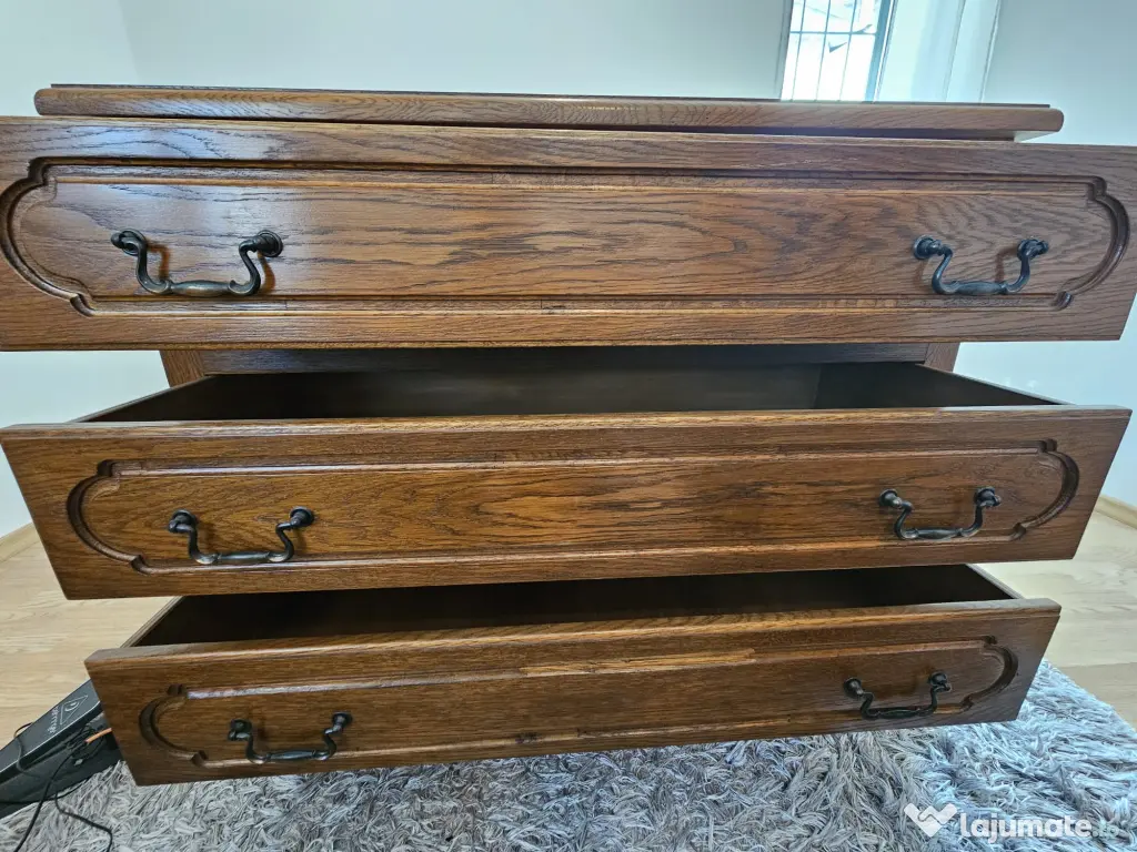 Noptiera realizata din lemn masiv, cu un design sculptat deosebit, care atrage imediat atentia. Piesa este solida, bine intretinuta si ofera atat utilitate, cat si un plus estetic oricarui spatiu.
