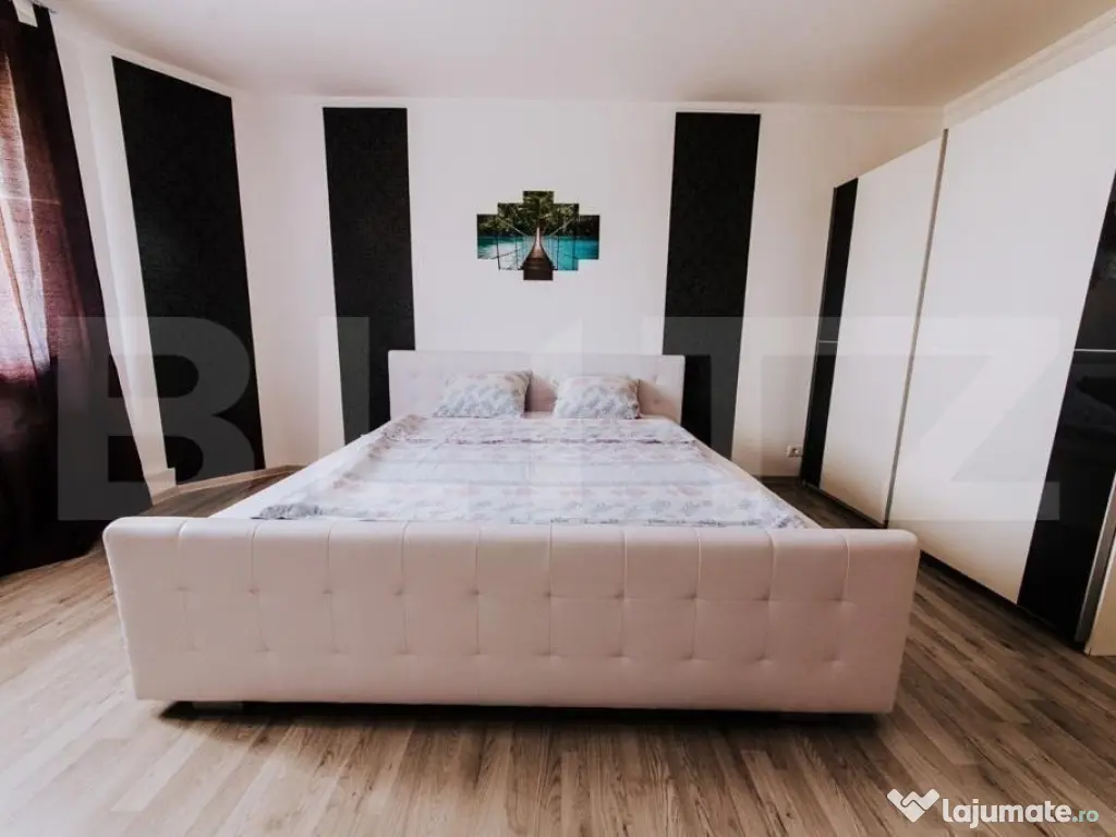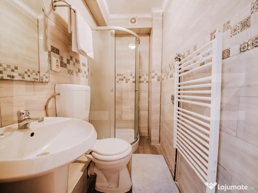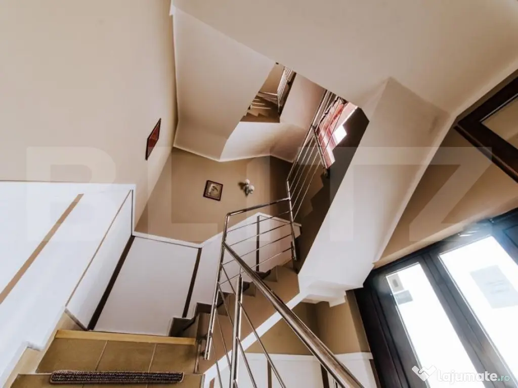 Blitz vă propune spre vânzare o vilă-pensiune în zona Mehala. Aceasta este construită pe un teren de 207 mp și are un regim de înălțime P+2E, în anul 2014. Are o suprafață utilă de 459 mp și este împărțită astfel: Parterul: 1 sală spațioasă, 1 cameră de depozitare, grup sanitar de femei și bărbați și 1 sală de așteptare. Etajul 1: 5 camere spațioase, fiecare cu baie proprie Etajul 2: 1 apartament spațios cu 2 camere, cu o suprafață de 60 mp și un balcon de 9 mp, 2 camere cu baie proprie. În curte se află o terasă de 28 mp. Aceasta este construită cu materiale de înaltă calitate fiind într-o zonă buna a Timisoarei, la 5 minute de mers cu masina de centrul orasului, aproape de magazine, stații de transport, carburant, școli, grădinițe, centru sportiv, teren de sport nou facut si altele. Proprietatea este SAD, se preteaza excelent pentru afaceri, investitii, cazare muncitori, pensiune, azil batrani, gradinita privata, videochat, airbnb etc.! Este inchiriata in acest moment si produce 2300 euro lunar. Aceasta se poate vinde cu diferite variante de bani, schimb cu apartamente+diferenta, etc.! Fotografiile cu mobilier sunt cu titlu de prezentare. Cod ofertă / ID BLITZ: P94546 Id intern: P94546 Număr niveluri imobil: 2 Număr Băi: 8 Nr. locuri parcare: 5-10