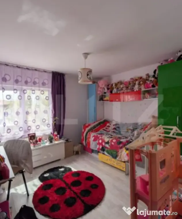 Curtea proprie este amenajată cu gazon, flori și loc de joacă pentru copii, creând un spațiu perfect pentru relaxare și petrecerea timpului liber alături de cei dragi.