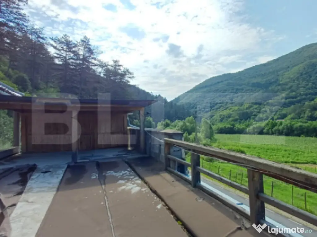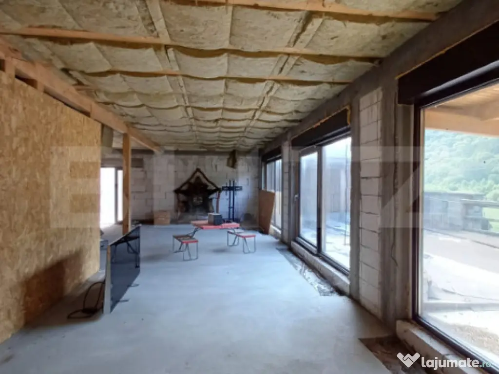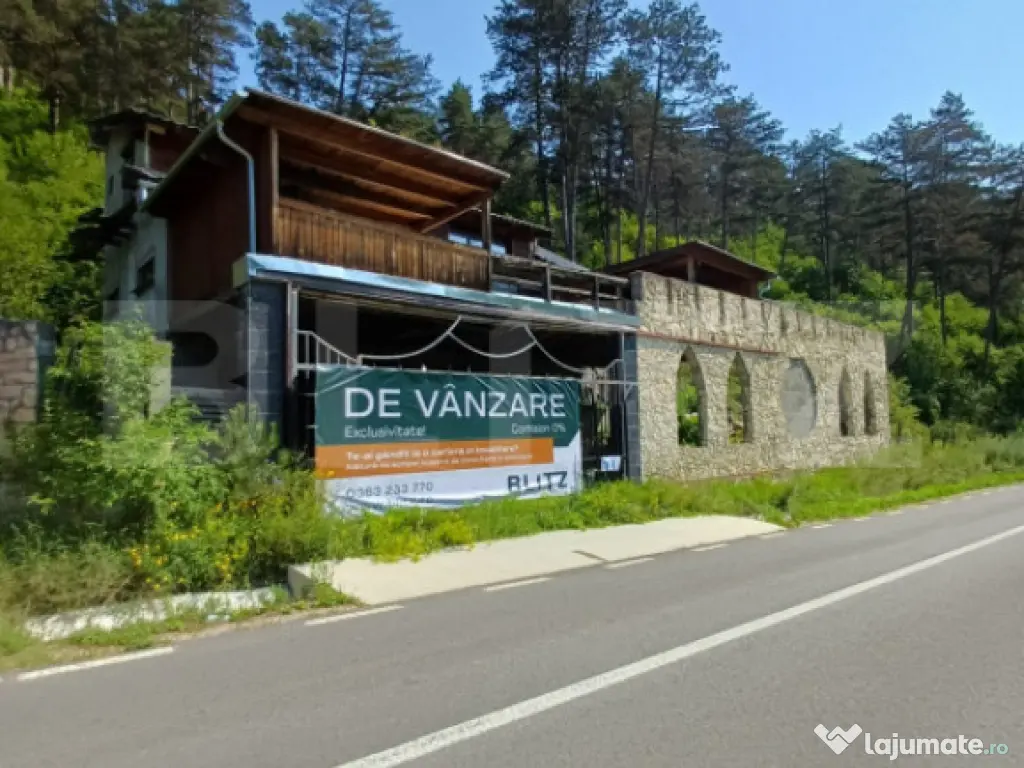 Blitz oferă spre vânzare o proprietate cu potential turistic, cu amprenta la sol 91 mp, dimensiuni construcție 7 m x 13 m, cu o suprafață totală de 247 mp. Construcția se dorește o îmbinare intre stilul mediteranean si cel medieval, în partea de NE fiind inițiată construirea unui turn iar gardul prezintă un segment care sugerează un zid de protecție crenelat cu elemente gotice. Accesul pe proprietate se face din DJ 107M acces asigurat indiferent de anotimp. Deschiderea totală la sosea este de cca 125 ml. Construcția este racordata la rețeaua publica de apa potabila. De asemenea este racordata la rețeaua de energie electrica, iar recent a apărut posibilitatea racordării la rețeaua de canalizare. Fiind orientata spre S este extrem de bine poziționată i vederea amplasării de panouri fotovoltaice. Stadiul de execuție a lucrării este “la gri”, fiind necesare lucrări de finisaj interior care pot fi realizate conform dorinței si bugetului noului proprietar. Proprietatea este structurata astfel: Zidarie parter din boltari de beton, armați si umpluți cu beton. La parter sunt prevăzute trei garaje cu uși automate tip rulou acționate din telecomanda, fără pereți despărțitori ceea ce permite o eventuală reconfigurare conform dorinței noului proprietar; dimensiunile ușilor de garaj L=3 m x H=2.5 m, iar in interior garajul are o înălțime de cca 3 m. Acces la etaj prin scara din lemn de stejar uscat in uscător, păstrată in culori natur; Accesul in locuința se face prin deschiderea unei uși culisante din stejar masiv care permite accesul la ușa din tamplarie de aluminiu cu geam termopan cu bariera termica. Etajul are aceeași suprafață de 91 mp ca primul nivel si este prevazut a fi un living mare cu trei geamuri tip vitrina, geamuri din tâmplărie de aluminiu cu sticla tripan si cu rulouri exterioare din aluminiu acționate prin telecomanda; Dimensiunea ferestrelor este de L 3 m x H 2.5 m asigurând practic întreagă fațadă sudica cu suprafață vitrata care pe lângă faptul ca poate fi obturata prin coborârea rulourilor, beneficiază de sticla tratată termic pentru limitarea pătrunderii căldurii pe timp de vara, respectiv pierderii căldurii interioare pe timp de iarna; Structural, nivelul este un living cu bucătărie open space si o baie mare, de asemenea cu scara interioară realizată din metal care duce la următorul nivel unde sunt prevăzute doua dormitoare cu en-suite fiecare; Scopul urmărit a fost acela de a realiza o casa pasiva d.p.d.v. energetic, profitând si de faptul ca pe jumătate casa este îngropată in pământ, in speță partea din spate a construcției a fost hidroizolata cu materiale de cea mai buna calitate împrejurare care conferă pe timpul verii o răcorire naturală respectiv pe timpul iernii o încălzire naturală, adică acest aspect înseamnă o factura de încălzire/răcorire cu cel puțin 50% mai mica decât in cazul unei locuințe obișnuite; Dacă sunteți în căutarea unei proprietăți multifuncționale, cu potențial mare de profit, această ofertă este alegerea perfectă! Contactați-ne pentru mai multe detalii sau pentru a programa o vizionare. Comision zero! Cod ofertă / ID BLITZ: P146778 Id intern: P146778 Număr niveluri imobil: 1 Număr Băi: 4 Curent Apă
