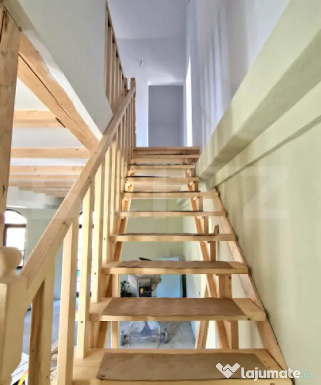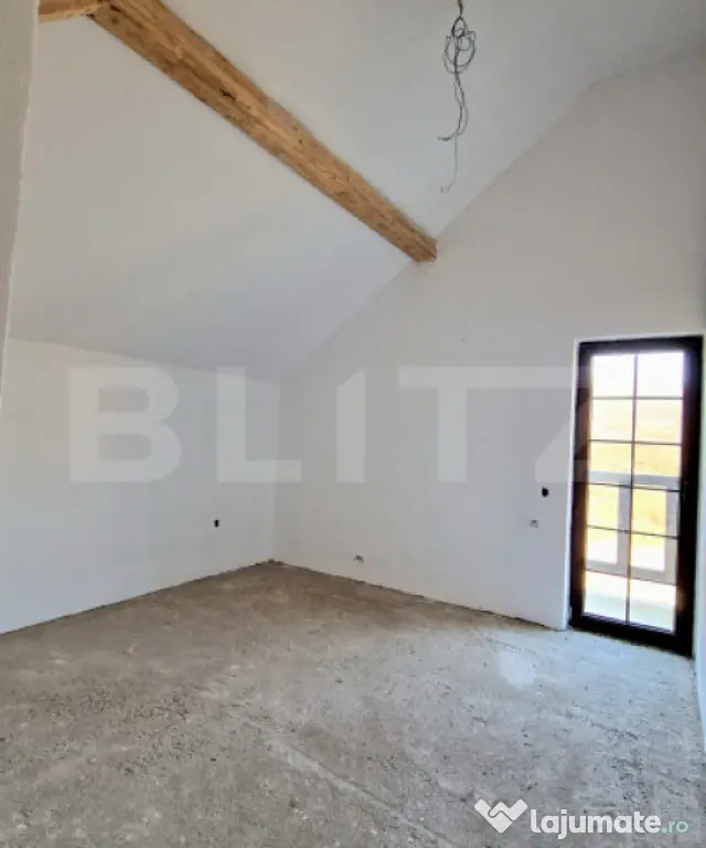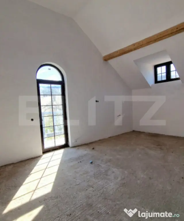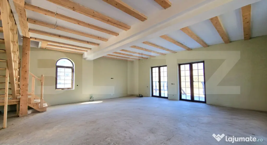Construcția are o suprafață utilă de 180 mp și se află în stadiu semifinisat, permițând viitorului proprietar să o amenajeze după propriul concept. Stilul rustic și înălțimea generoasă a dormitoarelor (3.5 m) creează un ambient aerisit și autentic.