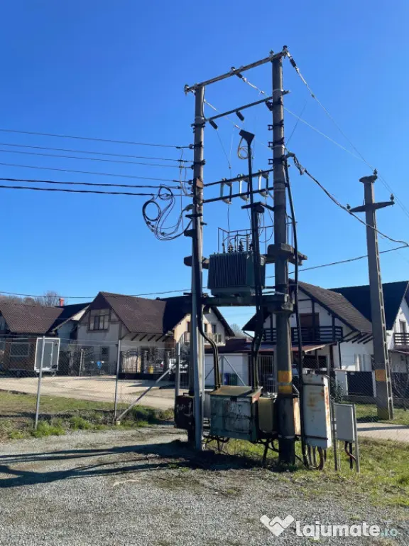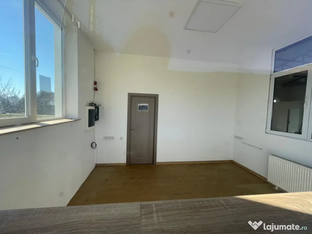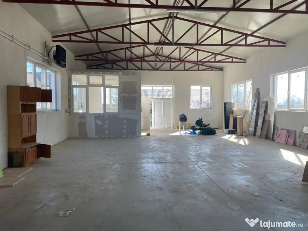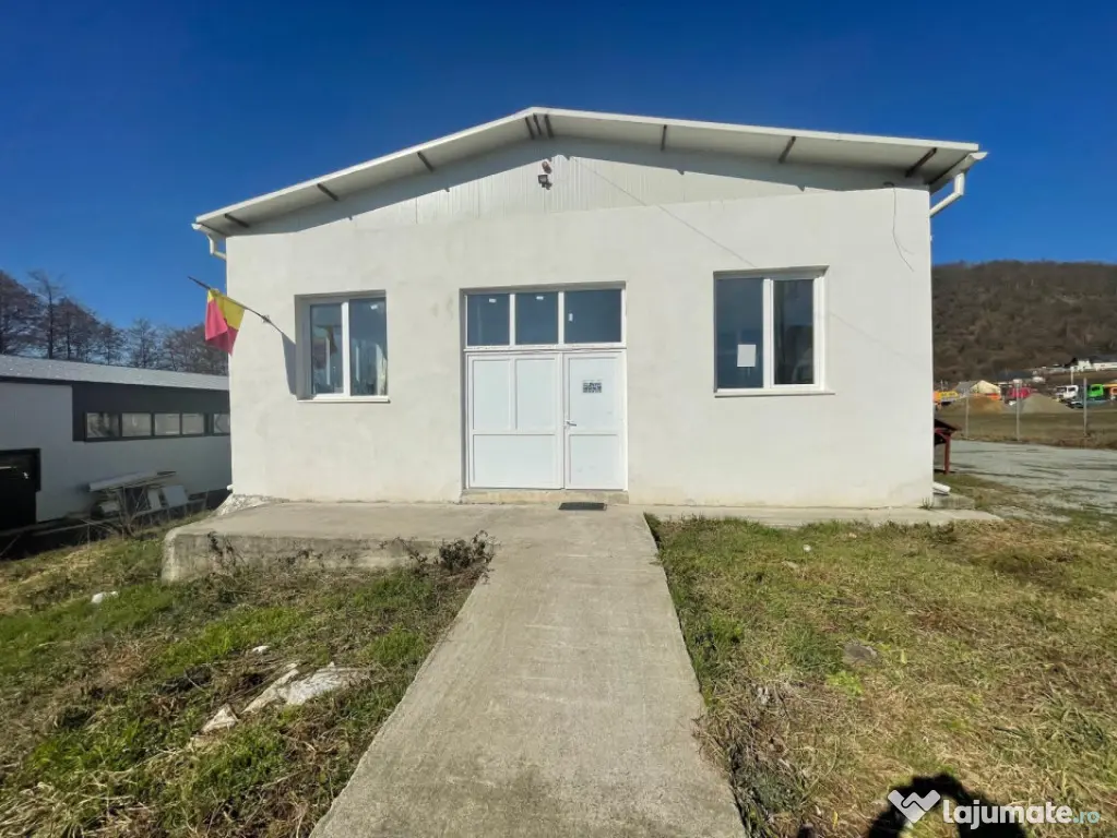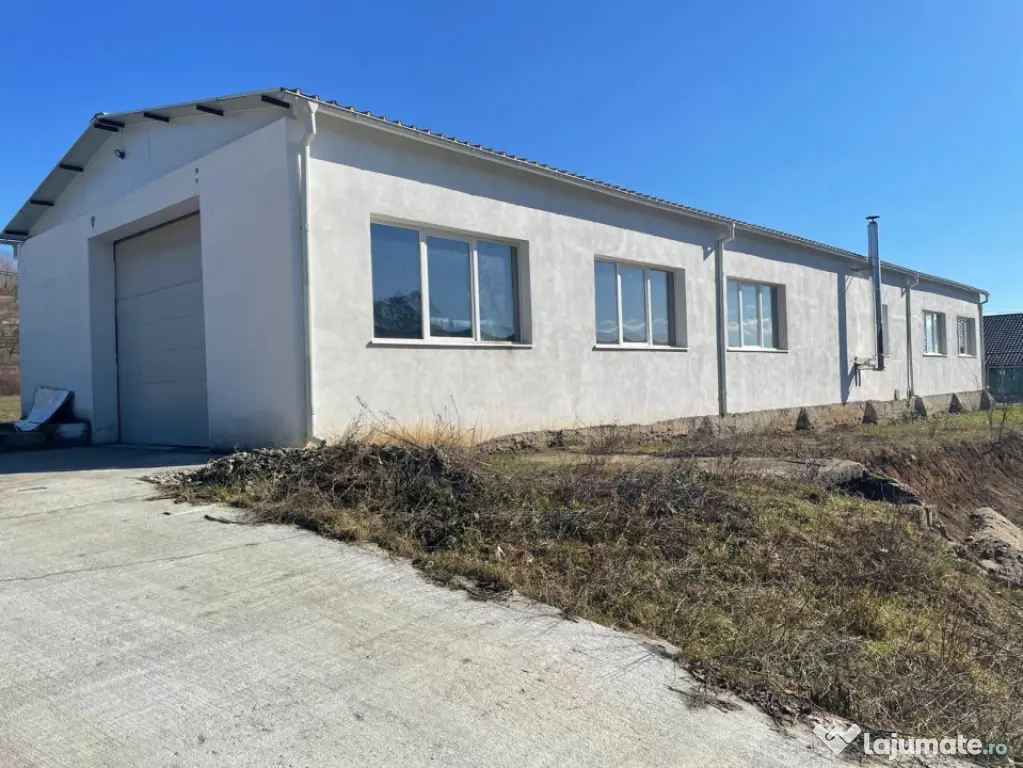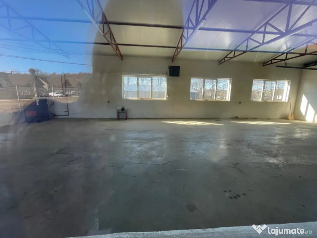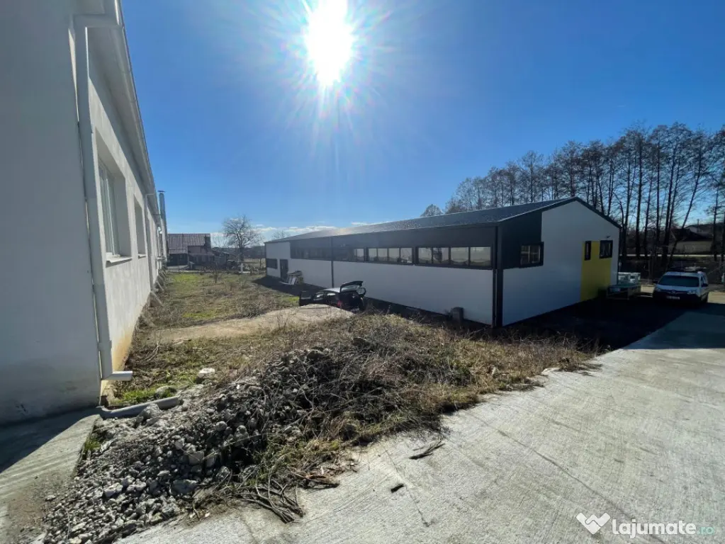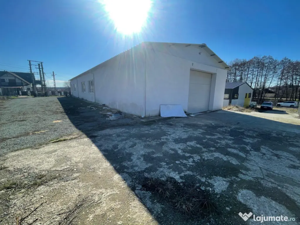Hala 2: din caramida si beton, are suprfata de 439 mp, inaltime de 4 m la varf si dispunde de o usa mare pentru acces masini mari; are un birou de cca 10mp si o baie, in rest hala nefiind compartimentata. are montata centrala noua pe lemne pentru incalzire; beneficiaza de acces TIR si contorizare separata mono si trifazic; geamurile mari asigura si aici o vizibilitate maxima in interior.