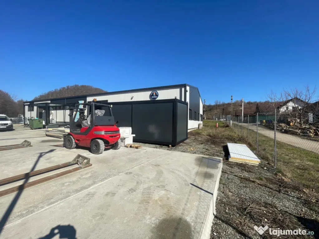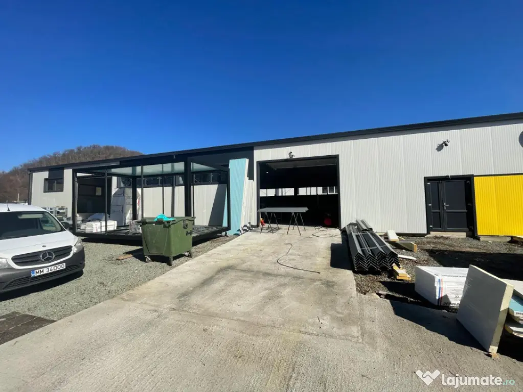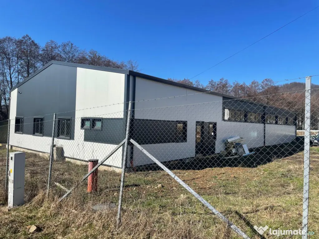Hala 1: este NOUA, din panouri sandwich, cu grosime de 8cm, in suprafata de 543 mp, inaltime la varf de 5m, si 2 usi mari de acces cu inaltimi de 4,2m; hala este necompartimentata, cu exceptia unui birou de 10 mp si a unei toalete; hala are pe 2 laturi platforma betonata si permite acces TIR pana in dreptul usilor; prevazuta cu geamuri mari pentriu vizibilitate crescuta, dispunde de curent mono si trifazic, contorizat separat;
