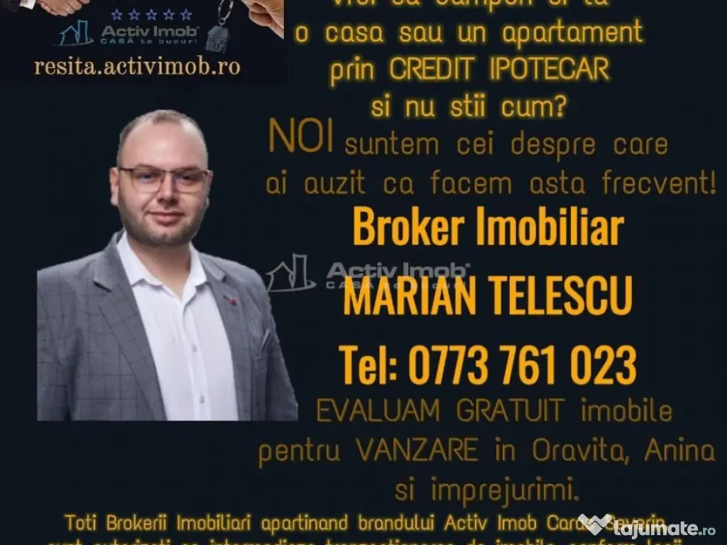 1. BENEFICII PENTRU CLIENTII ACESTEI OFERTE CU ZERO COMISION CUMPARATOR; Posibilitate de Cumparare si prin Credit Ipotecar. Biroul imobiliar ActivImob Oravita va propune spre vanzare un apartament aflat la etajul 4, al unui bloc cu regim de inaltime P 4 etaje si 3 apartamente pe palier, confort 1, decomandat, compus din 3 incaperi mari si luminoase: o sufragerie spatioasa, un dormitor, o bucatarie generoasa - deschisa cu acces in balcon, o baie (prevazuta cu geam de aerisire, cada, boiler pt apa calda, WC) si 1 hol, totul la o suprafata de circa 55 mp; - Apartamentul se afla intr-un imobil reabilitat termic, detine in administrare loc pentru construirea unei boxe de lemne de 4mp si acces in uscatoria comuna a blocului, aflata la parter. - Imobilul este renovat recent si detine instalatie sanitara noua, instalatie electrica noua, lumina pe casa scarii, izolatie termica exterior, acoperis fara probleme de infiltratii. - Incalzirea este asigurata de 2 sisteme de climatizare dintre care doar unul montat in sufragerie, celalalt cu posibilitate de montare in dormitor/bucatarie, are usa metalica noua la intrare, usi interioare noi de lemn, parchet in sufragerie si dormitor, in stare excelenta, gresie si faianta in bucatarie, baie, hol si balcon. Noul cumparator se poate racorda la cosul exterior a-l blocului amplasat intre dormitor si balcon. - Blocul din care face parte apartamentul este amplasat intr-o zona linistita, scara este mai curata decat pantofii de nunta, ingrijita permanent, administrata corespunzator si vecini unul si unul. - Apartamentul este foarte luminos, curat si ingrijit, aerisit, nu prezinta urme de infiltratii sau miros neplacut, fiind ideal pentru investitie sau locuinta permanenta. - Imobilul se vinde mobilat si partial utilat, cum se vede in poze, iar pretul este negociabil la fata locului. De ceS Pentru ca sunt proprietati care nu se judeca din poze. La vizionare vezi potentialul real, pozitionarea si toate oportunitatile, iar negocierea se face corect, pe masa, dupa ce stii exact ce cumperi. Daca si dumneavoastra aveti o proprietate in Oravita, Anina sau oriunde in Judetul Caras-Severin si doriti sa o vindeti sau sa o inchiriati, va rugam sa sunati la numerele de telefon 0773 761 023 - Marian Telescu sau 0726 204 150 - Costin Rusu si vom crea un profil personalizat pentru vanzarea sau inchirierea acesteia, vizibil pe site-ul de imobiliare al tuturor carasenilor: resita.activimob.ro 2. Beneficii oferite de zona: - situat aproape de statii de autobuz si statie de Taxi; - la 5 min. de Gara si parc special amenajat pt copii; - la 5 min. de mijloc transport in comun si magazine, farmacii, etc.; - la 2 min. de ScoalaGen. Cls.I-VIII si gradinita, 15 min de Liceu; - la 10 min de complexul comercial de magazine Lidl, Penny, Pepco, Kik. RECOMANDARE: PENTRU A VIZUALIZA TOATE OFERTELE SI A PRIMI NOTIFICARI CU NOILE OFERTE, VA RUGAM SA SOLICITATI CERERE DE PRIETENIE PE FACEBOOK: Imobiliare Marian Telescu Oravita-Anina SAU TIKTOK: Telescu Imobiliare . 3. Situatia juridica: Aceasta proprietate detine informatii reale, fiind verificata si evaluata in prealabil de Compartimentul Suport Back-Office, detine contract de cumparare, cadastru, intabulare, este libera de sarcini si nu are datorii fiscale. 4. Unde se poate petrece timpul liber: - in imediata apropiere a mai multor restaurante, terase, pizzerii, precum si a unor farmacii si supermarketuri. - la 5 min de fast-food si diferite magazine; - la 10 min de complexul comercial unde se afla magazine precum Penny, Lidl, Imperial, Pepco, Kik, etc; - la 5 min Confort: 1 Tip imobil: Bloc de apartamente Număr Băi: 1 Comision cumpărător: 0% Posibilitate parcare: Da Nr. locuri parcare: 1