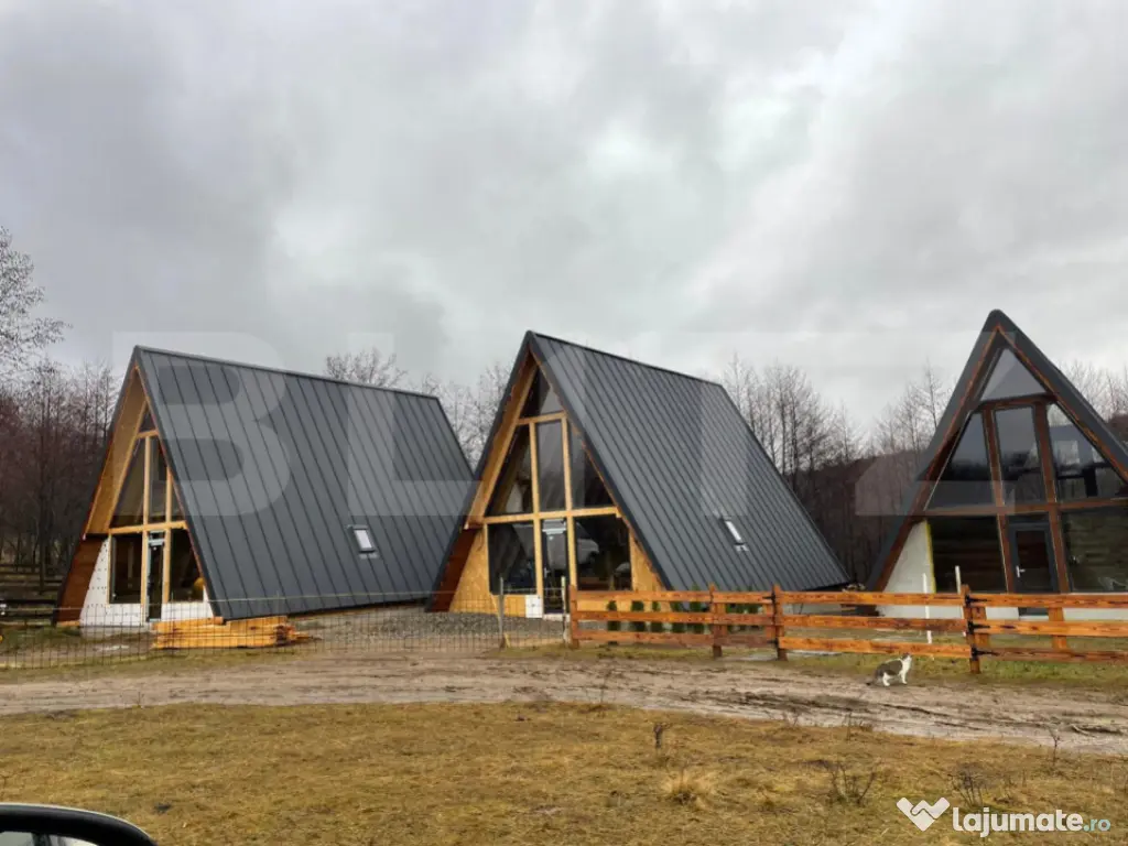 Acest pachet exclusiv de 3 case tip A-frame este amplasat într-o zonă de vis, cu panoramă deosebită către munți și beneficiază de soare pe tot parcursul zilei. Fiecare casă poate fi achiziționată individual sau ca parte a pachetului de 3 unități, ceea ce reprezintă o oportunitate excelentă de investiție, deoarece se pot închiria pe tot parcursul anului. Situate departe de agitația urbană, aceste locuințe oferă liniște și intimitate, având acces la toate utilitățile necesare. Casele sunt complet finisate și dotate cu materiale de cea mai bună calitate, incluzând apă de la izvor și o fosă ecologică. Fiecare casă dispune de un teren de 400 mp, împrejmuit cu gard de calitate, și include 4 camere: un living spațios tip open space, 3 dormitoare, o bucătărie complet utilată, o cameră tehnică și o baie modernă. Construcțiile sunt acoperite cu tablă de înaltă calitate și au o fundație izolată de 90 cm. Ferestrele și ușile sunt de asemenea de calitate superioară, având glafuri realizate manual. Pe lângă confortul oferit de centrala proprie pe gaz , avem si curentul tras pe proprietate, locuințele dispun și de două terase ce facilitează accesul și tranziția între ieșiri. Accesul este asigurat pe drumuri întreținute de autorități, iar colectarea gunoiului se face de la poartă. Prima casă este finalizata, iar următoarele două se vand exact ca in poze . Toate unitățile vor fi intabulate . Va asteptam la vizionare . IMPORTANT! Aceasta oferta este pana la sfarsitul lunii IULIE 2025, la achizitia celor trei case , pretul fiind mult mai mare pe o singura bucata. Cod ofertă / ID BLITZ: P135740 Id intern: P135740 Număr Băi: 1 Nr. locuri parcare: 3 Utilități: Curent