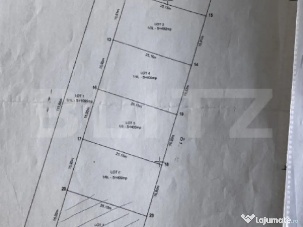 Blitz vă propune spre vânzare 4 parcele de teren intravilan, fiecare având suprafața de 400 mp și un front stradal de 15,91 ml, ideale pentru construirea unei locuințe individuale sau a unei mici investiții rezidențiale. Parcelele beneficiază de acces facil printr-o stradă privată cu lățimea de 9 m, ceea ce asigură un acces comod și o bună organizare a viitorului ansamblu. Conform PUG, terenul permite edificarea de construcții cu regim de înălțime P+2, având un POT de 35% și un CUT de 1,15, oferind astfel posibilități generoase de dezvoltare. Amplasarea este foarte avantajoasă, în apropiere de DN6, iar poziționarea terenului oferă o priveliște frumoasă către oraș, combinând accesibilitatea cu un cadru plăcut pentru locuire. Parcelele se pot achiziționa individual sau împreună, fiind potrivite pentru construcția unei case. Pentru mai multe informații nu ezitați să ne contactați! Cod ofertă / ID BLITZ: P166504 Id intern: P166504