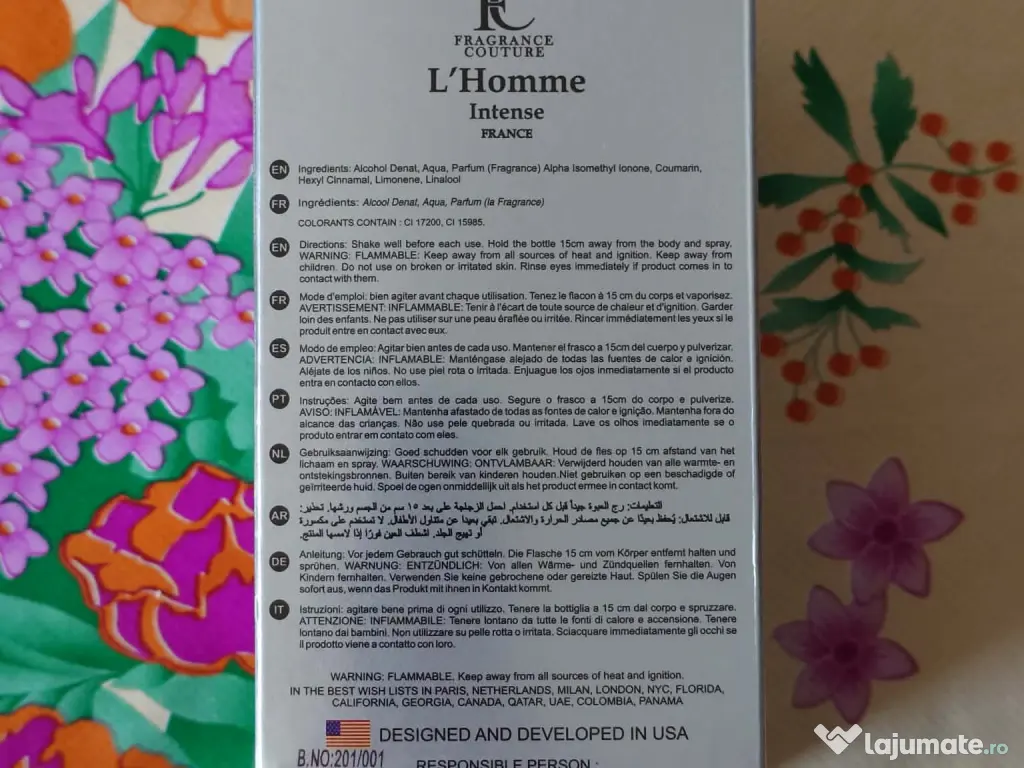 L' Home Intense France - apa de parfum pentru barbati ,100 m, ideal pentru un cadou minunat.Notele de varf sunt lamaie, piper negru si bergamot; notele de mijloc sunt floare de portocal, pelin si frunza de violeta; Notele de baza sunt Ambergris, note lemnoase, rasina benzoica, pielarie, piele intoarsa si cedru.