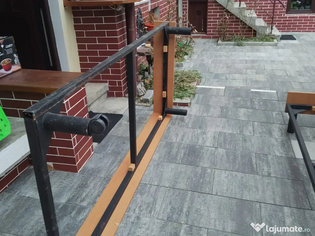 Cadru de pat metalic de 90x200 cm, folosit, în stare bună. Cadrul este realizat din metal negru și are detalii decorative din lemn. Poate fi utilizat pentru a susține o saltea de dimensiuni standard.