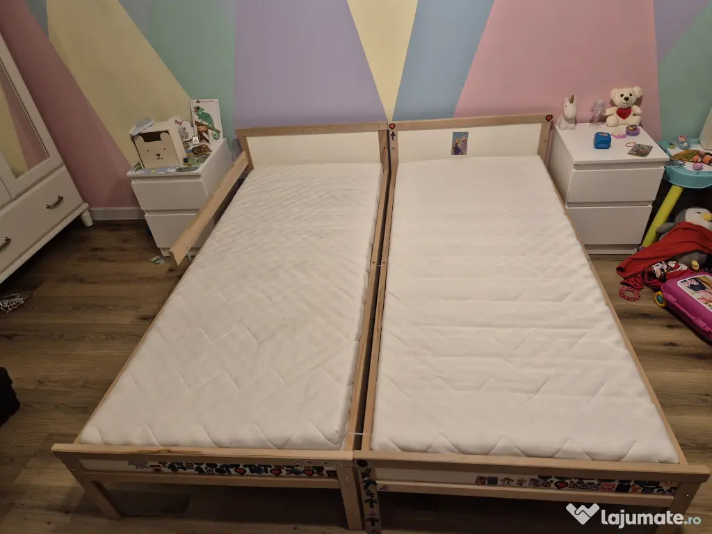 Vand doua paturi pentru copii Sniglar, dimensiuni 70x160 cm. Paturile sunt în stare bună de utilizare, cu saltele incluse. Pot fi folosite pentru a crea un spațiu de dormit confortabil pentru copilul tău. Pretul per bucata este de 350 sau 650 ron pentru amândouă. Predare doar in București