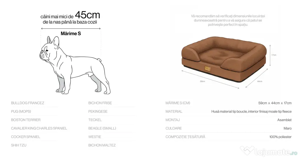 Cu trei dimensiuni diferite, patul este deosebit de potrivit pentru câini de talie mică, medie și mare, dar și ca culcuș pentru pisici.