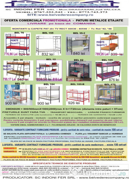 www.belvederecompany.ro Producator de PATURI METALICE - orice tipo/dimensiuni - modele diverse PRETUL ESTE FARA TVA Executam la comanda sau vindem din STOC, paturi metalice simple (1pers), duble(2pers), suprapuse/etajate, din profile rectangulare sau rotunde, si/sau fier forjat si/cu combinatii din cele mai diverse materiale: Realizam de asemenea la comanda serii de paturi metalice suprapuse/etajate orice tipo/dimensiuni - modele diverse Paturile metalice executate de firma noastra au o rezistenta deosebita si un design placut. Avem o gama variata de modele proprii dar lucram si dupa proiectul/modelul beneficiarului. Modelele pot fi realizate in mai multe nuante de culori in functie de optiunea clientului. Paturile metalice sunt foarte rezistente si rigide, au prinderea Somierei in suruburi (8 suruburi/somiera) si le ofera robustete, Somiera (suportul sustinere saltea) este complet metalic din profile sau platbenzi sudate si le ofera o foarte mare rezistenta, suportand greutati de 200-250Kg. Confortabile si solide realizate din profile metalice protejate impotriva zgarieturilor, deformarilor si ruperilor - usor de montat, demontat , transportat si depozitat. Constructie metalica care se poate demonta si detasa. Structura metalica le confera robustete si durabilitate. Asteptam cu interes cererile dumneavoastra, alegand produsele de calitate - la cel mai bun pret de pe piata. Pentru cantitati mari (min 40 set) se acorda discount de 2-8%, in functie de cantitatea comandata, sau se acorda ca discount TRANSPORTUL pana la BENEFICIAR. Dispunem de mijloace auto pentru Transport cu auto proprii, pentru livrari... PENTRU ORICE DETALII SI INFORMATII VA STAM LA DISPOZITIE www.belvederecompany.ro - Producator de PATURI METALICE