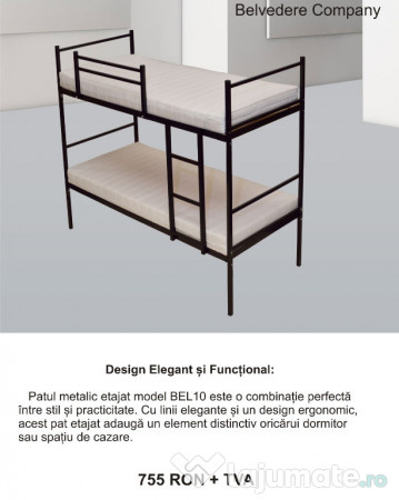 Producător de PATURI METALICE – www.belvederecompany.ro Vindem din STOC sau fabricam la comanda – paturi metalice etajate/suprapuse/supraetajate, simple (1pers), duble(2pers), din profile rectangulare sau rotunde, si/sau fier forjat si/cu combinații din cele mai diverse materiale orice tipo/dimensiuni - modele diverse Paturile metalice sunt foarte rezistente si rigide, confecționate din țevi si profile groase in carne 2-1,5mm. Structura metalica foarte robusta care se poate demonta si detașa. oferindu-le rezistenta si durabilitate mare. Somiera (suportul susținere saltea) este complet metalic din profile sau plat benzi sudate perimetral si le oferă o foarte mare rezistenta, suportând greutăți de 200-300Kg cu prinderea somierei in șuruburi (8 șuruburi/somiera) . Așteptam cu interes cererile dumneavoastră, alegând produse durabile si de calitate-la cel mai bun preț de pe piață. Pentru cantități mari se acorda discount de 2-8%, in funcție de cantitatea comandata, sau se acorda ca discount TRANSPORTUL pana la BENEFICIAR. PENTRU ORICE DETALII SI INFORMATII VA STAM LA DISPOZITIE - Detalii, informații si comenzi la Telefon & E-mail afișate.