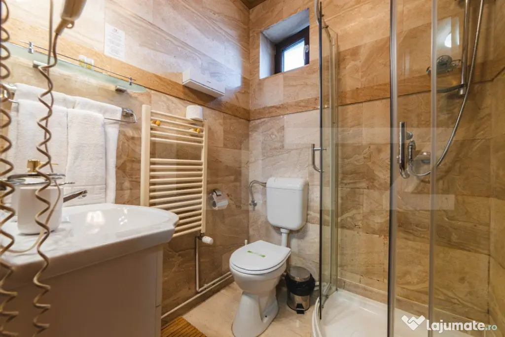 Parchet triplustratificat, marmură și mobilier din lemn masiv – fiecare colț al pensiunii reflectă rafinament și bun gust.