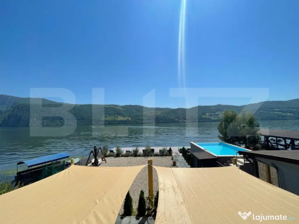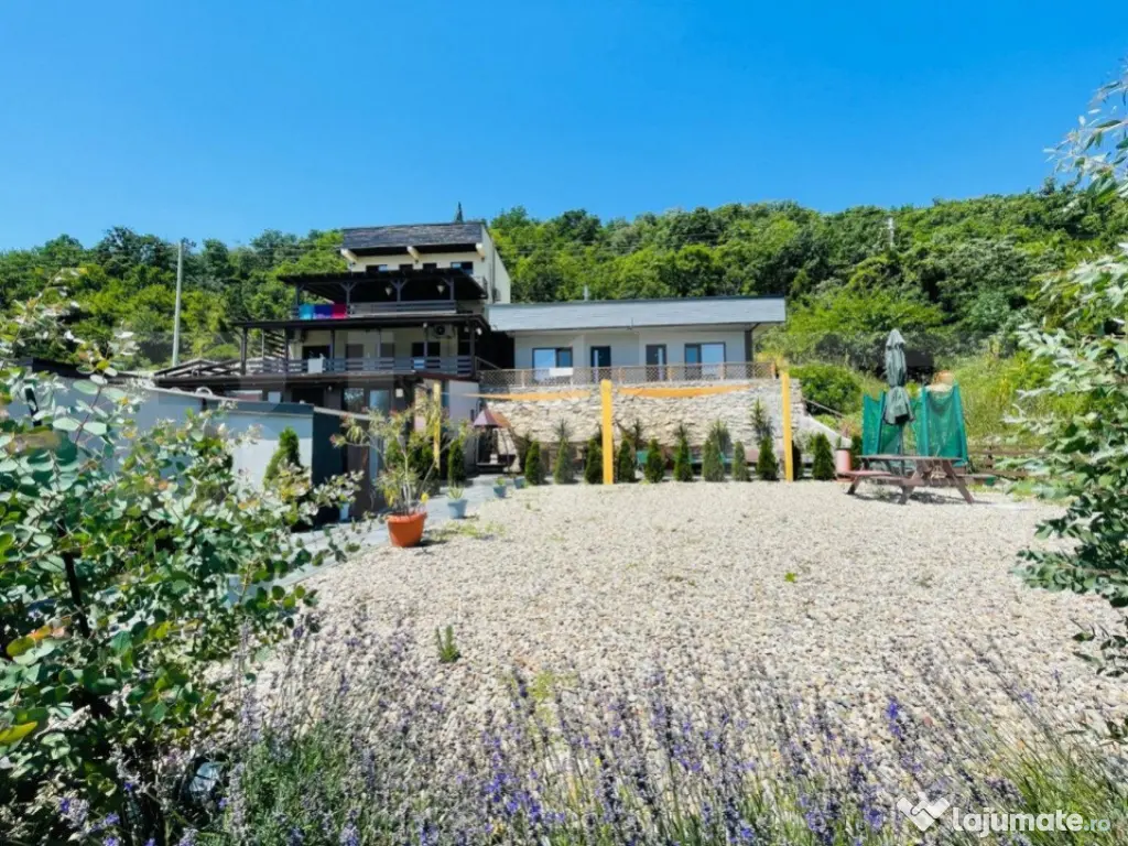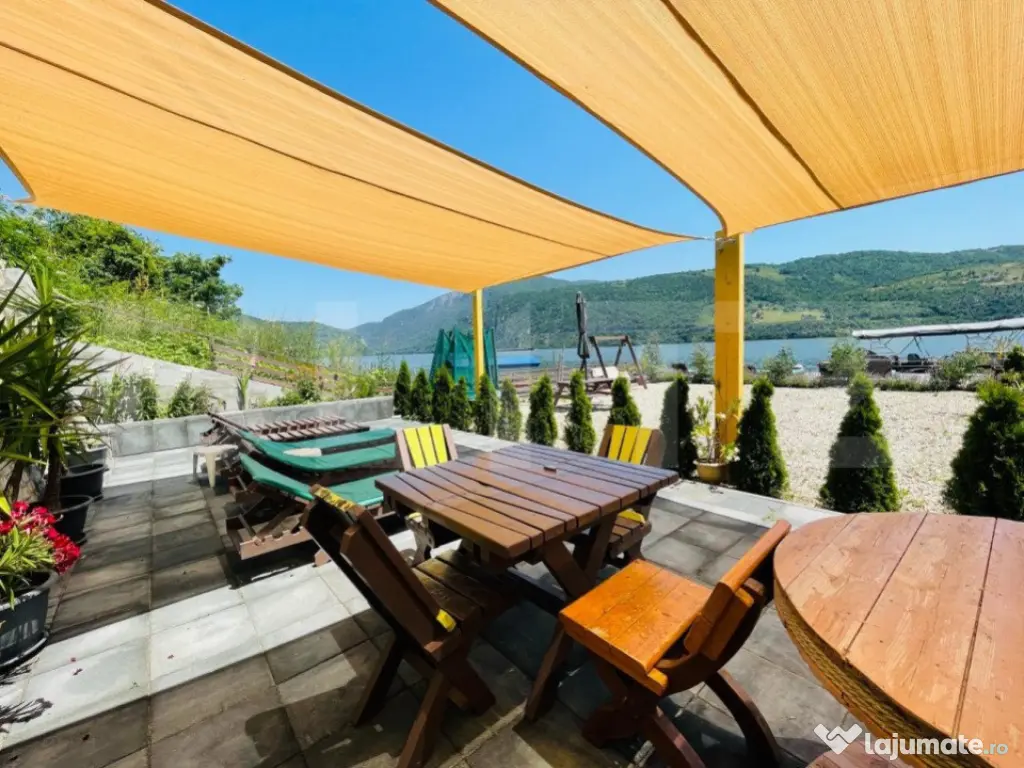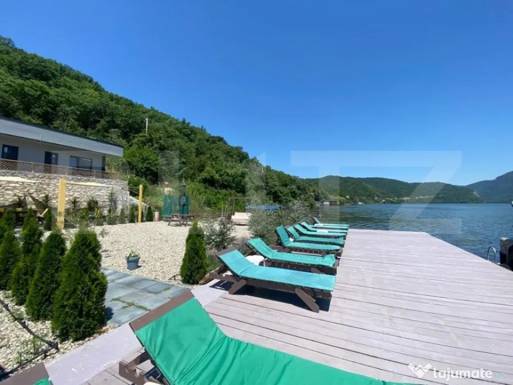Iti oferim oportunitatea sa investesti intr-o locatie magica! Dubova, pe malul Dunarii, liniste si atmosfera relaxanta, aici te asteptam sa-ti incepi noul business sau sa o transformati in casa de vacanta mult visata! Cu un rating exceptional de 9,8 pe Booking, proprietatea se intinde pe un teren 600 mp si are living spatios, 8 camere si doua studiouri, 10 bai, bucatarie exterioara, dotata si utilata. Vila are 360 mp utili, cu posibilitatea de extindere de 140 mp. Oaspetii se pot bucura de un peisaj superb, relaxandu-se pe pontonul proprietatii sau in piscina tip infinity, impreuna cu familia si prietenii. Exista spatiu pentru parcare, minim 8 locuri in fata proprietatii. Accesul este facil si oaspetii pot gasi locatia cu usurinta. In pretul pensiunii, va oferim si un catamaran cu o capacitate de 12 persoane, de care clientii vor fi incantati, cu siguranta! Va suntem la dispozitie pentru orice alte detalii sau informatii! Este o ocazie minunata sa va bucurati de valurile Dunarii, in pasi de vals! Cod ofertă / ID BLITZ: P8422 Id intern: P8422 Număr niveluri imobil: 2 Număr Băi: 10 Nr. locuri parcare: 5-10