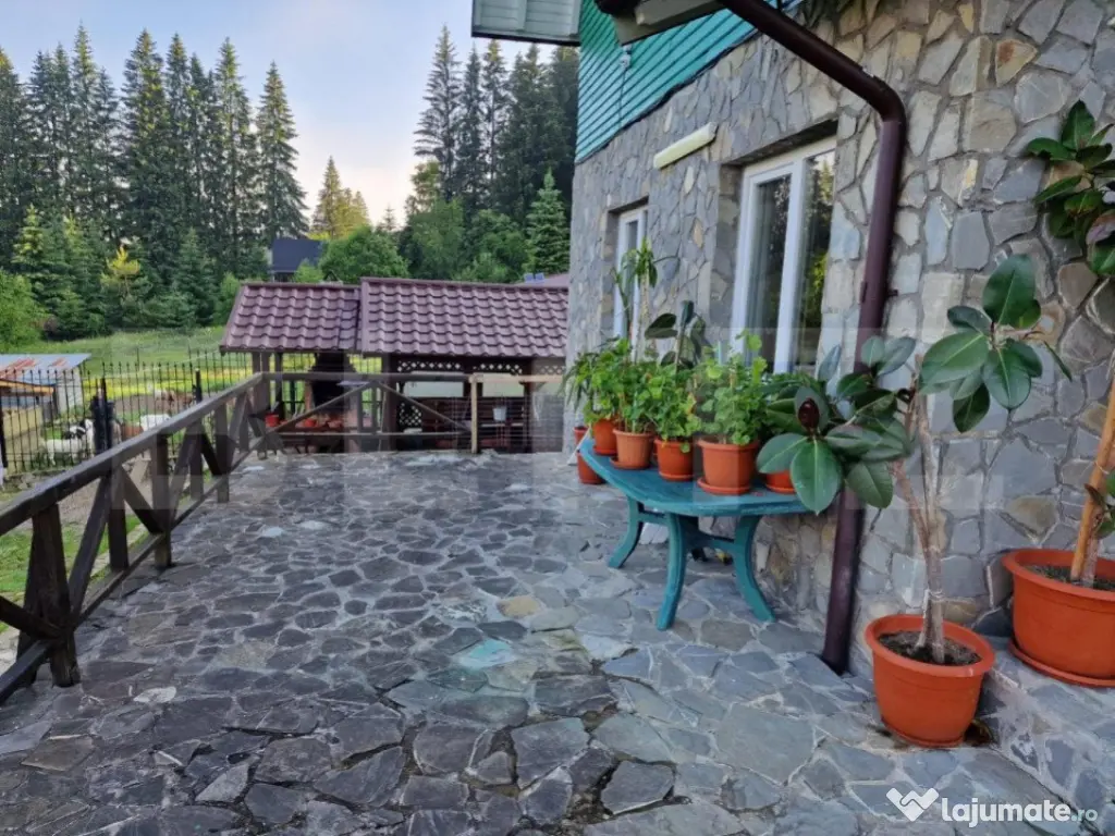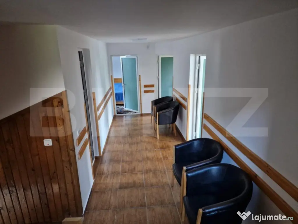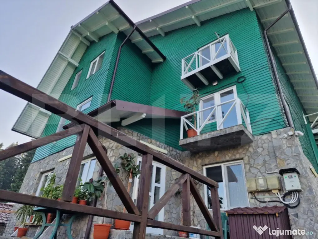 Blitz va porpune o oportunitate unică de a achiziționa o frumoasă pensiune situată la marginea pădurii, în incinta stațiunii montane Predeal. Această proprietate este amplasată într-o zonă liniștită și pitorească, oferind o atmosferă relaxantă și contact direct cu natura. Detalii despre proprietate: Suprafața terenului: aproximativ 5000 mp, oferind un spațiu generos pentru activități în aer liber și potențial de extindere. Compartimentare perfectă: pensiunea dispune de 7 camere confortabile, fiecare cu baie proprie, asigurând intimitatea și confortul oaspeților. Living spațios: un living generos poate găzdui până la 25 de persoane, oferind un loc ideal pentru relaxare și socializare. Bucătărie complet mobilată și utilată: pensiunea dispune de o bucătărie modernă, unde oaspeții pot prepara și servi mâncăruri delicioase. Spațiu tehnic versatil: acest spațiu poate fi utilizat atât pentru depozitare și întreținerea echipamentelor, cât și ca spălătorie pentru lenjerii. Curte amenajată perfect: proprietatea beneficiază de terase spațioase, unde oaspeții se pot relaxa și admira peisajul montan. Există și un foisor dotat cu facilități pentru grătar și un garaj pentru a asigura parcare sigură. Această pensiune oferă un potențial fantastic pentru a fi introdusă în circuitul turistic, având în vedere amplasamentul său privilegiat și facilitățile complete pe care le oferă. Este o oportunitate excelentă pentru cei care doresc să investească în industria ospitalității montane și să se bucure de beneficiile unei afaceri într-un mediu natural fermecător. Pretul si informatiile suplimentare vor fi furnizate la cerere. Pentru detalii și programarea unei vizionări, vă rugăm să ne contactați la numărul de telefon sau adresa de email de mai jos. Cod ofertă / ID BLITZ: P13905 Id intern: P13905 Număr niveluri imobil: 2 Număr Băi: 9 Nr. locuri parcare: 5-10