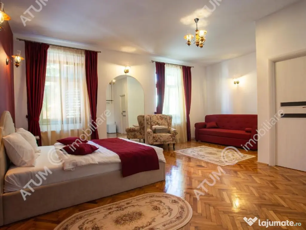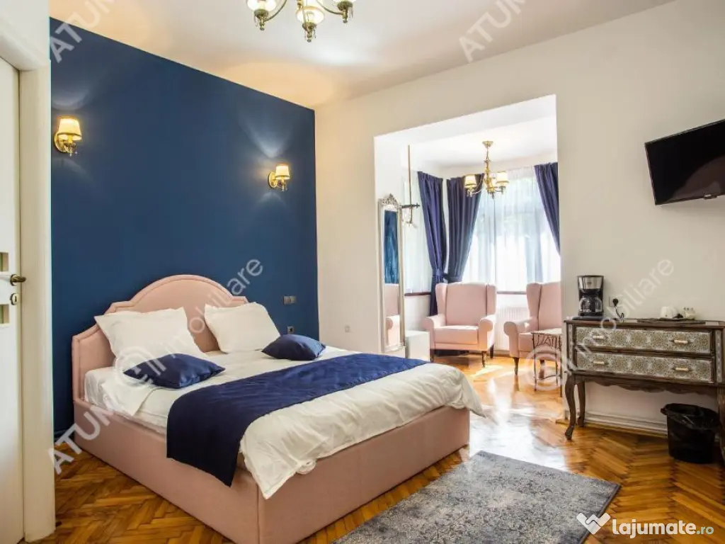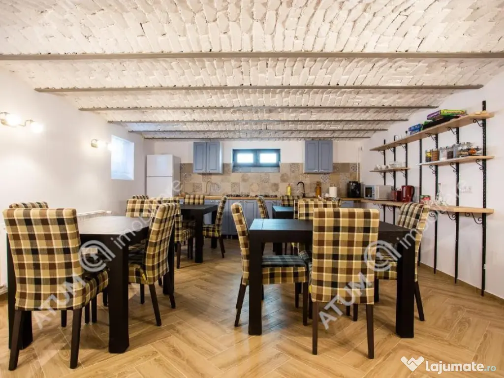 Va prezentam o oportunitate remarcabila de achizitie: o pensiune la cheie, situata in Centrul Istoric al orasului Sibiu. Proprietatea este compusa din 6 camere si este amplasata pe un teren generos de 407 mp. Suprafata utila de 240 mp este distribuita pe 2 etaje, subsol si parter. La subsol, veti gasi un hol generos de 11 mp, o bucatarie spatioasa cu loc de luat masa in suprafata de 48 mp, o baie de 4 mp si o camera tehnica de 18 mp. Parterul este compus dintr-un hol de acces cu suprafata de 20 mp, care include si zona de receptie, 5 camere spatioase cu suprafete cuprinse intre 15 mp si 30 mp, fiecare dotata cu baie proprie, precum si casa scarii care faciliteaza accesul la subsol si la mansarda, unde exista posibilitatea de amenajare a unor camere suplimentare. In plus, proprietatea dispune de o curte libera de 139 mp si o magazie pentru depozitare de 90 mp. Renovata in anul 2019, pensiunea este dotata cu cele mai moderne facilitati pentru confortul oaspetilor. Beneficiaza de doua centrale termice proprii marca Ariston, instalatie termica din cupru, calorifere termostatate din otel, un puffer de 500 litri, usa de acces din PVC marca Veka, tamplarie PVC marca Veka cu 6 camere si 3 foi de sticla, echipate cu feronerie Roto, prize si intrerupatoare marca Schneider Sedna, usi interioare din lemn si sticla securizata, si finisaje de calitate precum gresie, faianta si parchet din lemn masiv. Baile dotate cu cada sau cabina de dus si geamuri de aerisire. Proprietatea se vinde complet mobilata si utilata, iar in plus, beneficiaza de un sistem de supraveghere video in exterior si curte pavata cu dale de beton. Valoarea de achizitie este de 780.000 euro. Aceasta pensiune reprezinta nu doar o investitie excelenta, ci si o oportunitate de a va alatura industriei turistice din Sibiu, un oras cu un potential turistic imens. Modalitatile de achizitie sunt flexibile, putand fi efectuate atat icirc;n numerar, cat si prin credit. ID Intern: 2210. An finalizare construcție: 1901 Stadiu construcţie: Finalizat Număr încăperi: 6 Posibilitate parcare: Da Nr. locuri parcare: 5