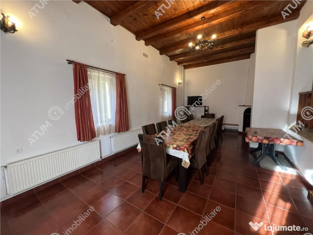 De vanzare cabana/vila compusa din 7 camere, 5 bai si o terasa de 15 mp, situata in Paltinis, cu deschidere la drumul principal DJ 106 A. Imobilul are o suprafata totala de 267 mp si dispune de o curte libera de 127 mp. Este alcatuit din Parter 2 Etaje Mansarda si dispune de spatiul tehnic unde este situata centrala pe lemne. Edificata in 2007, constructia beneficiaza de anvelopare termica la exterior cu vata bazaltica. Planseele care fac legatura intre Parter - Etaj 1 si Etaj 1 - Etaj 2 sunt realizate din beton armat iar cele superioare, care fac legatura intre Etaj 2 - Mansarda si Mansarda - Pod sunt realizate din lemn. Imobilul a fost conceput pentru a desfasura activitate comerciala dar poate fi folosit si pentru uzul propriu, atat ca destinatie de vacanta, cat si ca una permanenta. Suprafata utila a imobilului este de 210 mp, desfasurati pe suprafata parterului, celor 2 etaje si la mansarda. In situatia actuala, la parter se afla zona de receptie, camera tehnica grup sanitar, casa scarilor si o terasa acoperita de 30 mp. La etajul 1 se afla camera de zi cu loc de luat masa, bucatarie si 2 grupuri sanitare femei/barbati si hol iar la etajul 2 unitatea dispune de 4 dormitoare ( 1 camera tripla cu baie proprie si 3 camere duble ) si o baie. Mansarda a fost configurata pentru 2 dormitoare. La suprafata utila a imobilului se adauga si 1 terasa acoperita de aprox 30 mp, la parter si o terasa neacoperita de 15 mp, la etajul 1. Amenajarile au fost realizate dupa finalizarea constructiei, in anul 2007 si includ urmatoarele: centrala termica pe lemne si calorifere din otel; apa calda este asigurata de cele 3 boilere; tamplarie PVC cu geam termopan, instalatie termica si electrica din cupru; usile de acces din metal si din lemn iar usile interioare sunt din lemn; pardoseala este realizata din dusumea de lemn masiv, pardoseala bailor si a bucatariei este placata cu gresie; zugraveli realizate pe baza de vopsea lavabila.Imobilul este disponibil spre vanzare imediata si se preda mobilat si utilat pentru a putea desfasura activitate in domeniul HORECA sau uz personal ca si casa de vacanta. Zona in care se afla imobilul este usor accesibila, frontul stradal fiind de 15 m. Proprietatea este inconjurata de natura si de constructii vecine care deservesc ca si locatii pentru uz personal sau pensiune, se afla in apropiere de partia Arena Paltinis. La momentul de fata in vederea modernizarii si extinderii proprietatii au fost demarate toate procedurile si planurile pentru a fi aprobate. Valoarea de achizitie este de 260.000 euro negociabil si se poate achizitiona si prin intermediul unui credit bancar. ID intern 3048. An finalizare construcție: 2007 Stadiu construcţie: Finalizat Număr încăperi: 7 Posibilitate parcare: Da Nr. locuri parcare: 3