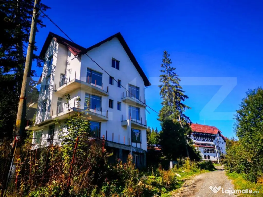 Pensiunea este o investiție sigură și profitabilă pentru un investitor în domeniul turismului. Imobilul se desfășoară pe o suprafață construita de 600 mp, repartizați în D+P+2E+M. și dispune de electricitate, canalizare, apa curentă și gazele sunt în curs de realizare.