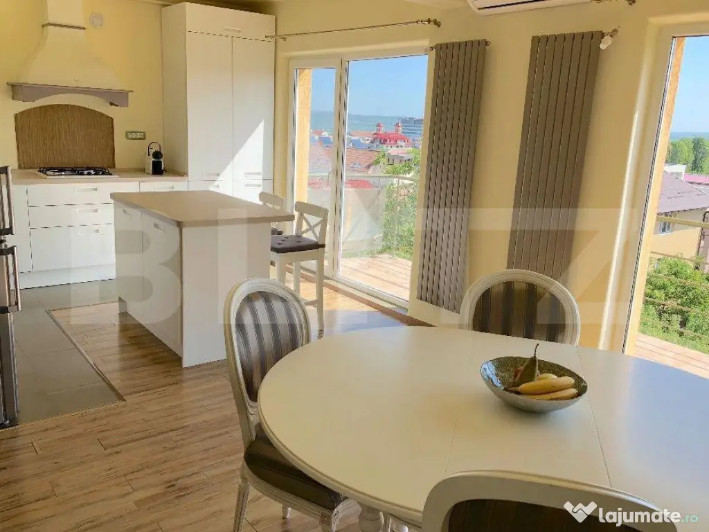Bucătăria, fabricată în Italia, este complet utilată cu electrocasnice de top: Franke, Bosch (mașină de spălat vase), combină frigorifică Bosch, iar confortul termic este asigurat de centrală proprie Viessmann și aer condiționat pe fiecare nivel .