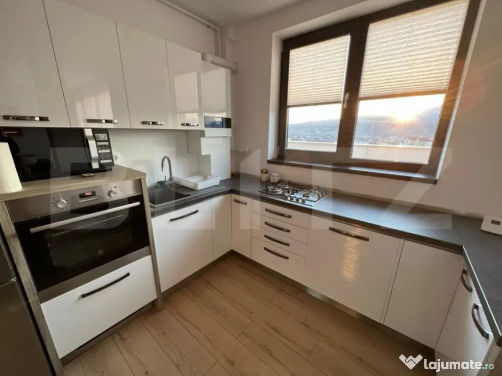 Blitz propune pentru vanzare o proprietate exclusivista in cel mai modern cartier dezvoltat in Alba Iulia in ultimii ani. Fiind situata la ultimul etaj intr-o cladire care dispune de doua lifturi ( la 34 de apartamente ) , privelistea de la etajul al 8-lea face aceasta proprietate una din cele mai dorite proprietati din Alba Iulia. Foarte aprope de Lidl, Profi, Altex, Kaufland si bazinul olimpic, dar si stadionul municipal si statii de autobuz, aceasta proprietate poate fi considerata ca fiind amplasata in mijlocul orasului. Materialele folosite in cadrul dezvoltarii imobilului si lucrarile din punct de vedere calitativ sunt la cele mai inalte standarde disponibile pe piata. Proprietatea compusa din doua dormitoare separate ( unul dintre domitoare dispune de baie proprie cu cada ), ambele avand iesire individuala pe un balcon comun cu suprafata de 9 mp. Zona de living se delimiteaza de bucatarie printr-o zona tip bar si care inmagazineaza masina de spalat vase si alte multiple zone de depozitare. Bucataria este complet mobilata si utilata cu echipamente bosch de ultima generatie. A doua baie creaza si cea mai mare surpriza a proprietatii prin supradimensiunarea de care se bucura si prin faptul ca dispune de acces in terasa proprietatii printr-o usa de comunicare. Proprietatea dispune de boxa de depozitare situata la demisolul cladirii si avand acces cu liftul pana la acest nivel. Loc de parcare si cartier privat cu bariera. Merita toata atentia dumneavoastra ! Pretul include TVA deductibil Cod ofertă / ID BLITZ: P13139 Id intern: P13139 Confort: 1 Tip imobil: Bloc de apartamente Număr Băi: 2 Nr. locuri parcare: 1