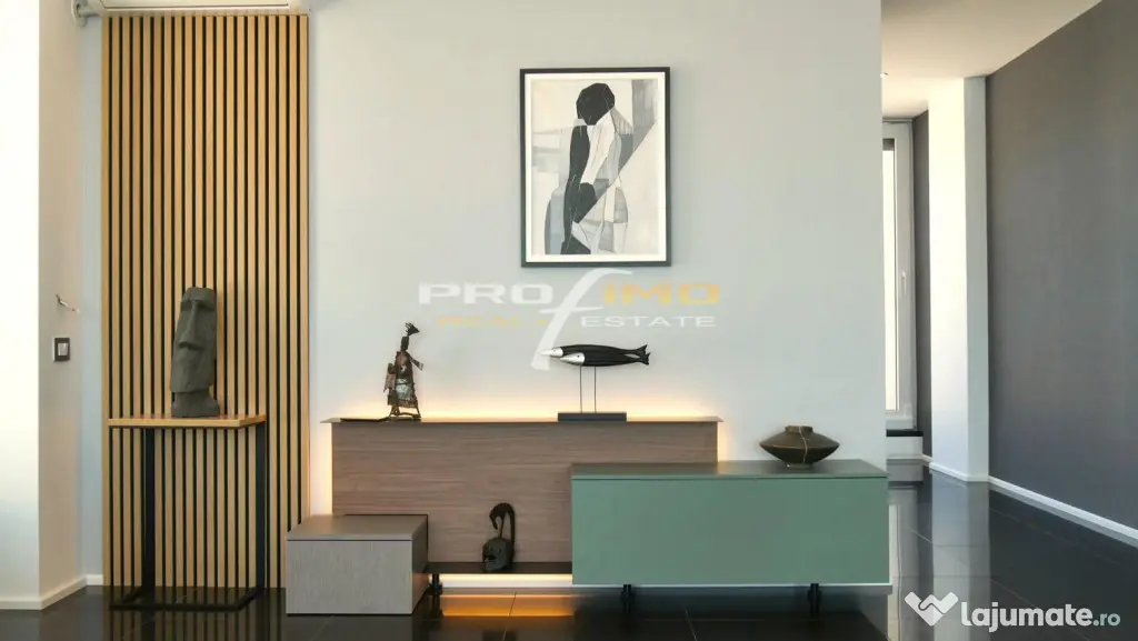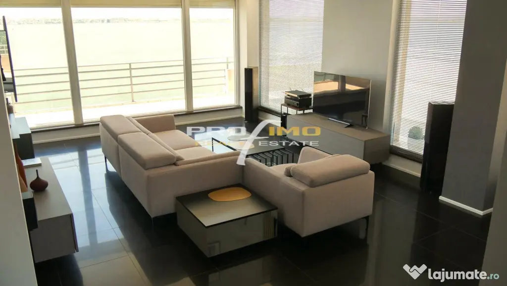 Locuinta ocupa singura un etaj iar compartimentarea include un living foarte mare, si zona de dining, bucatarie, dormitor matrimonial cu baie proprie, dormitor de oaspeti , baie serviciu, vestibul, camera depozitare ,o terasa de 155 mp cu vedede pe lac, mare si piscina si loc de parcare acoperit.