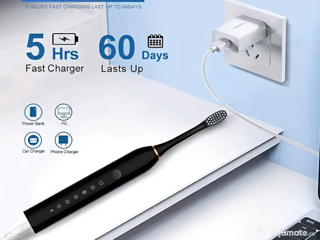 Periuță de dinți electrică cu temporizator inteligent cu 6 viteze, portabilă, USB reîncărcabilă,