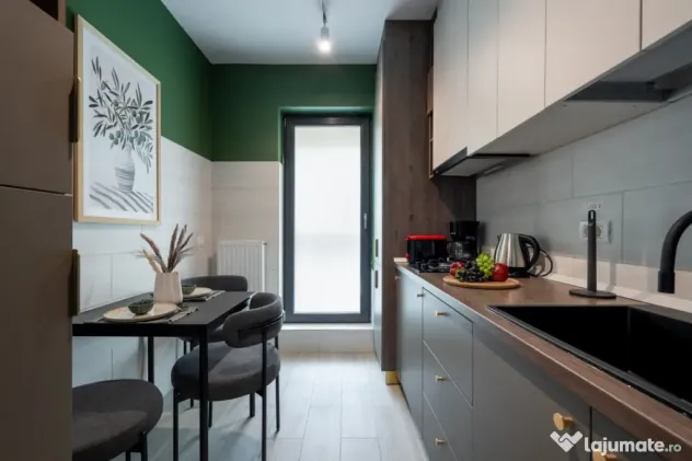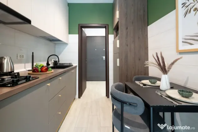 Va prezint o garsoniera - la prima închiriere. Mobilata și utilata complet, proiect făcut de designer, foarte bine gandit pentru a imbina confortul cu utilul.
