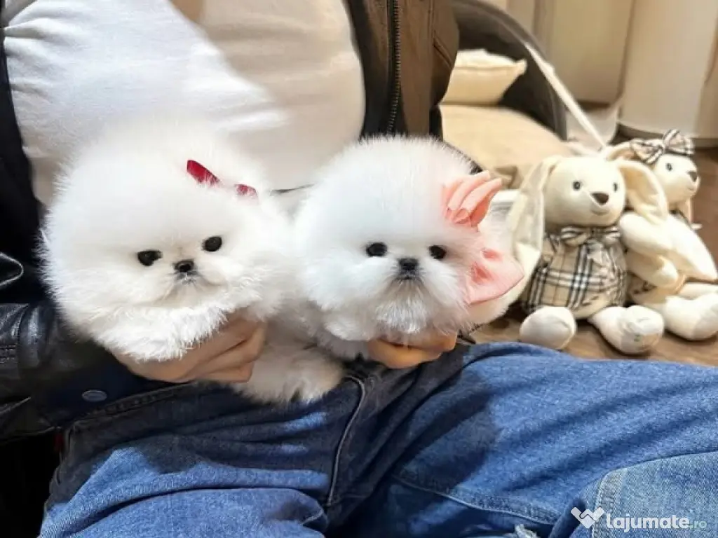 Ofer spre vânzare puiuț Pomeranian mini toy ursuleț, acesta provine din părinți cu pedigree și crește maxim 2kg la maturitate. Este pufos cu o blană albă, structura osoasă mică.