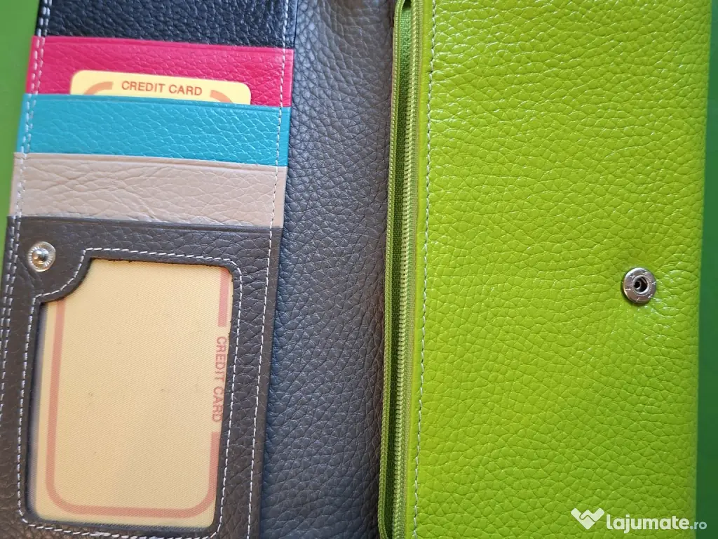 Portofel verde din piele, lungime 18 cm, este nou, se deschide din ambele parti, compartimentat foarte bine, multe locuri de carduri si incap toate bancnotele.