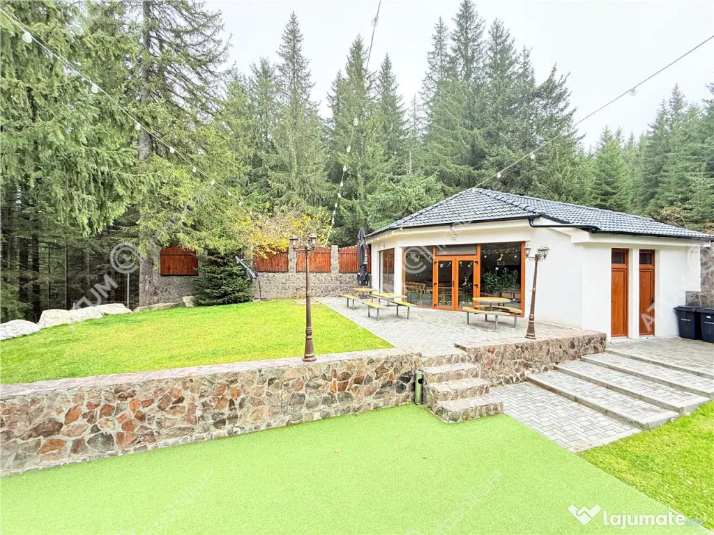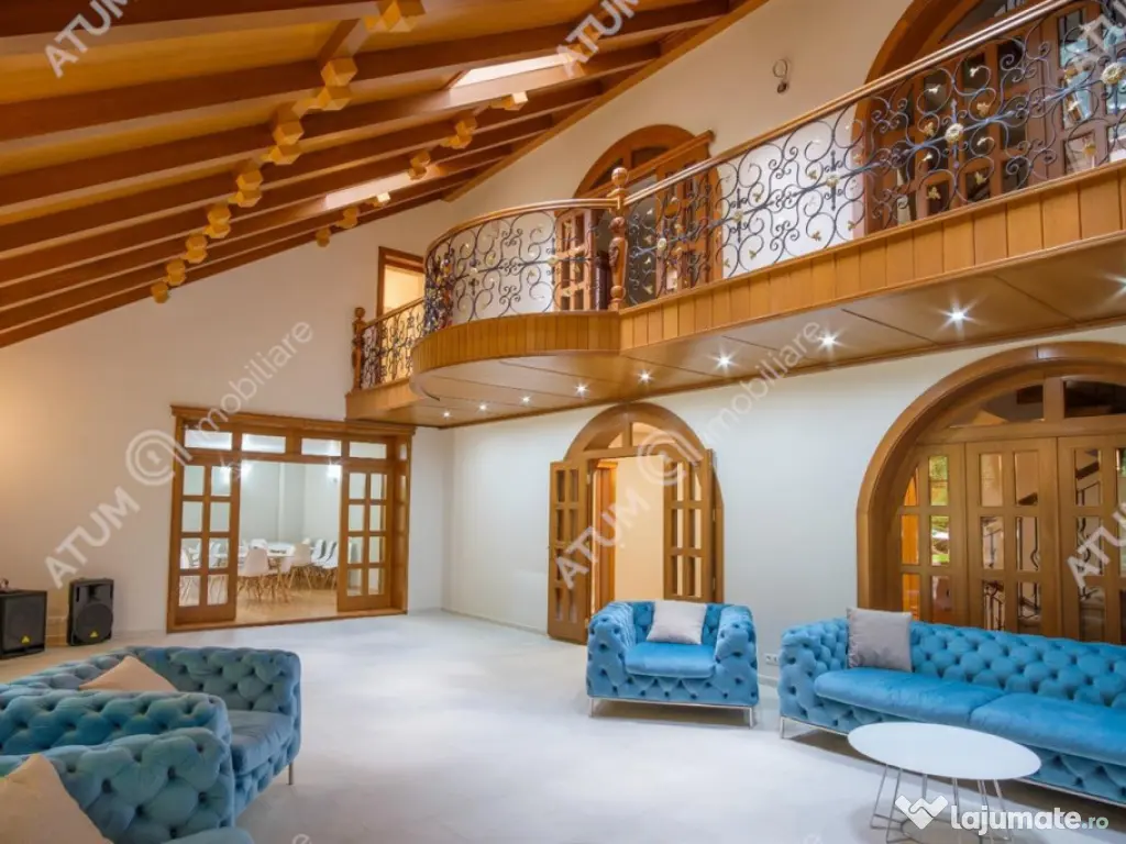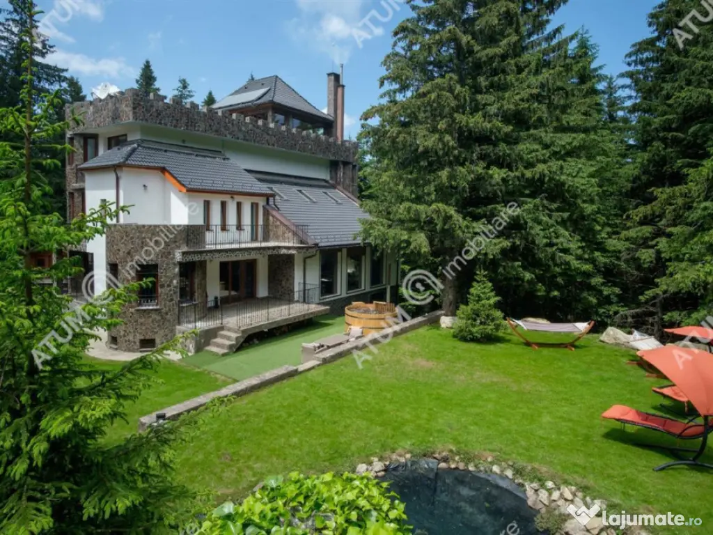 Intr-un cadru natural de o frumusete rara, la doar 30 de minute de Sibiu, se afla una dintre cele mai spectaculoase proprietati private din Romania, o resedinta unica, amplasata in statiunea montana Paltinis, la peste 1.400 de metri altitudine. Pozitionata intr-o zona complet retrasa, inconjurata integral de padure de conifere, proprietatea ofera o intimitate absoluta si o experienta de viata in armonie deplina cu natura. Accesul se face pe drum asfaltat, in conditii excelente, iar odata ajuns, ai senzatia ca ai pasit intr-un colt de lume exclusivist, in care timpul incetineste si linistea devine un lux palpabil. Construita pe un teren generos de 2.700 mp, scos din fondul forestier si incadrat ca teren intravilan, resedinta se remarca printr-o arhitectura spectaculoasa, inspirata din eleganta castelelor montane, cu accente rustice si elemente moderne. Edificata in anul 2005 pe structura solida de beton si placata integral cu piatra cioplita manual, proprietatea a fost complet renovata si modernizata in 2020, la standarde contemporane de confort si rafinament. Fiecare detaliu, de la finisajele din lemn masiv la sticla, piatra naturala si elementele de fier forjat, transmite calitate, rafinament si atentie desavarsita pentru estetica si durabilitate Resedinta se desfasoara pe demisol, parter si trei etaje, avand o suprafata utila de 640 mp si o suprafata construita de 910 mp. Spatiile interioare sunt gandite pentru confort si experienta, fiecare nivel avand o functionalitate distincta: - Demisolul este destinat relaxarii si recreerii, cu o zona SPA completa: piscina interioara (55 mp), jacuzzi, sauna pentru 6 persoane, zona de relaxare, receptie, spatii tehnice si camera de depozitare. - Parterul ofera o zona de zi spectaculoasa: un living generos de 58 mp cu acces pe terasa, o sala de mese eleganta (30 mp), bucatarie complet mobilata si utilata (32 mp), o camera cu baie proprie si doua terase exterioare placate cu piatra naturala. - Etajul 1 cuprinde 4 dormitoare luxoase, fiecare cu baie proprie si balcon, unul dintre ele beneficiind de o terasa privata de 16 mp. - Etajul 2 dispune de 3 dormitoare spatioase, fiecare cu baie si balcon individual. - Etajul 3 gazduieste o incapere vitrata de relaxare cu o vedere panoramica asupra padurii, ce se deschide catre o terasa circulara spectaculoasa de 72 mp, accesibila si prin liftul exterior. Proprietatea beneficiaza de un sistem modern de incalzire cu centrala pe lemne/peleti cu incarcare automata, doua pufare mari, doua boilere, pompa de caldura pentru zona SPA si panouri solare. Parterul este incalzit prin pardoseala, iar restul cladirii prin calorifere din otel si sistem de climatizare. Toate camerele sunt mobilate cu piese de mobilier de calitate superioara, tamplarie si usi din lemn masiv, iar baile sunt complet echipate si finisate cu materiale premium. Pe langa corpul principal, proprietatea include o cladire secundara de 100 mp utili, compusa din 4 dormitoare, 2 bai, o camera de zi, spatiu tehnic si garaj de 22 mp. In curte se afla si un foisor inchis, complet echipat pentru petreceri private ( cuptor pentru pizza, gratar pe lemne, plita pe lemne si plita electrica ). Exteriorul este un adevarat paradis natural: Terenul de 2.700 mp este complet amenajat cu gazon si sistem de irigatie automat, alei pavate, gard din piatra si lemn, iluminat ambiental, ciubar pentru 12 persoane, zona BBQ si spatiu de joaca. Totul este gandit pentru confort, relaxare si intimitate absoluta, intr-un ca An finalizare construcție: 2005 Stadiu construcţie: Finalizat Număr încăperi: 15 Posibilitate parcare: Da Nr. locuri parcare: 10-20