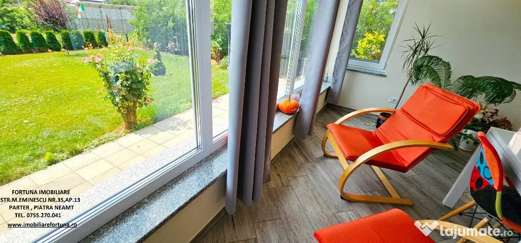 Proprietatea oferă nu doar eleganță și confort la interior, ci și o curte amenajată inovativ, practic și atrăgător, printr-un proiect aventurier și ingenios, foarte minuțios și inteligent utilizat, fiind organizată cu alei, gazon, o multitudine de flori și plante ornamentale - verde și frumos de jur împrejur -, pomi fructiferi pe rod, totul bio. În gradină avem livadă pe rod, vița de vie, zonă de zarzavat, arbuști care oferă un loc perfect pentru agrement.