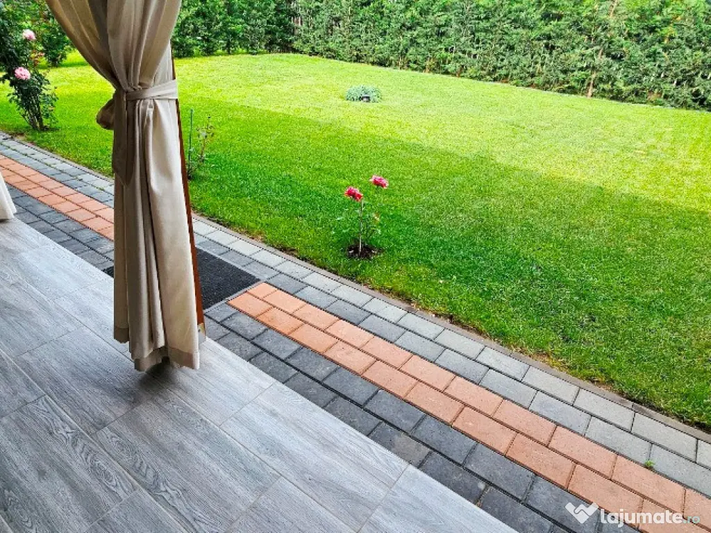 Proprietatea deține o curte foarte frumos amenajată cu gazon, flori si plante ornamentale și beneficiază de toate utilitățile urbane: apă, curent, gaz metan, canalizare.