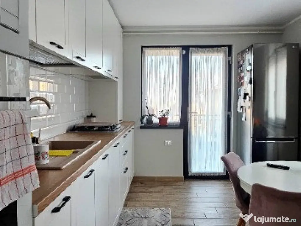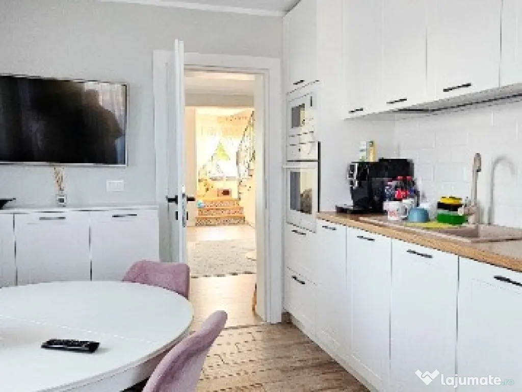 Se vinde echipată complet, cu tot necesarul pentru a vă asigura un trai confortabil, așa cum este prezentată în fotografii, o casă – cămin moderna, eleganta, practică, mobilată și utilată cu mult bun gust și rafinament, cu mobilier realizat la comandă și electrocasnice „Electrolux”.