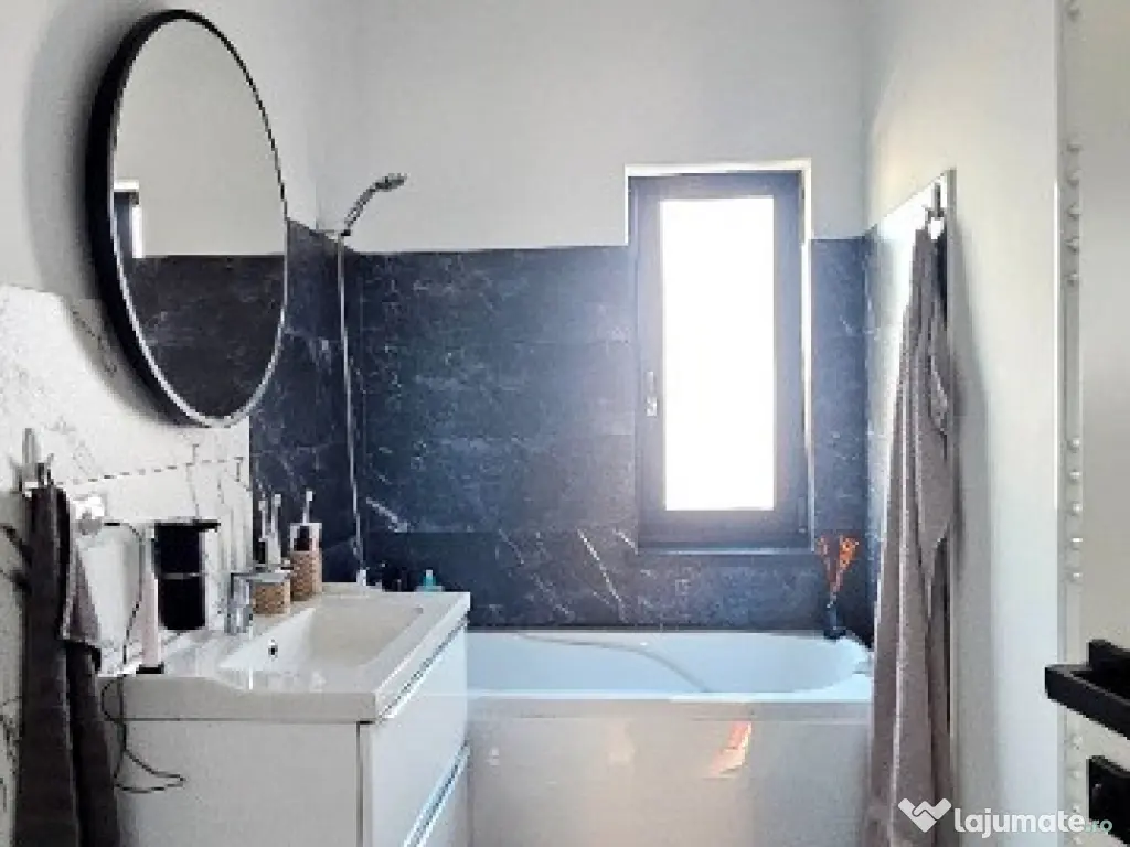 - La parter : hol, baie, bucătărie generoasă, living modern și spațios cu ieșire în terasă mare acoperita și în curtea interioară;