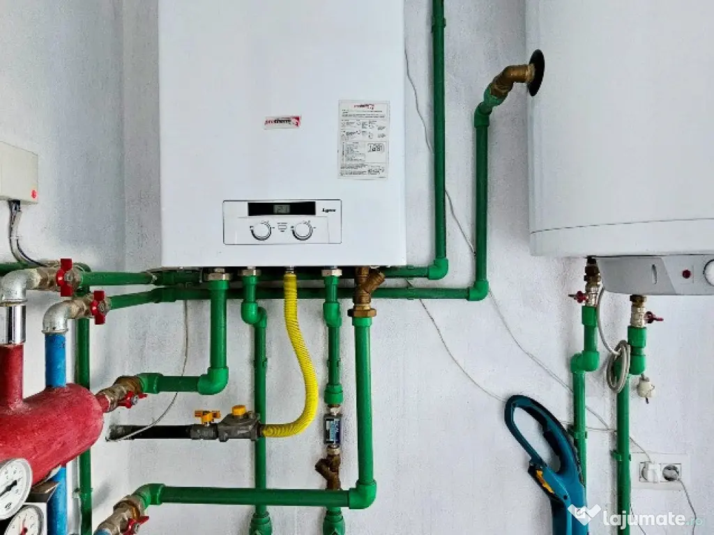 Tot la parter avem camera tehnică unde este instalată centrala pe gaz (conectată la rețeaua de calorifere calibrate pe fiecare cameră), ce asigură eficiență termică ridicată pentru întreaga casă.