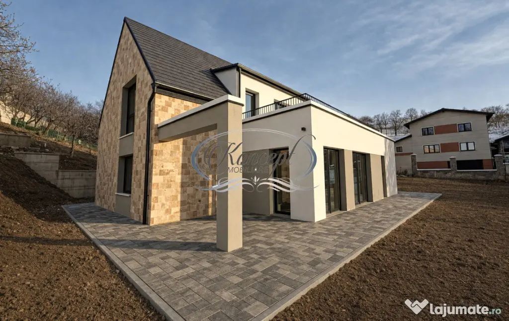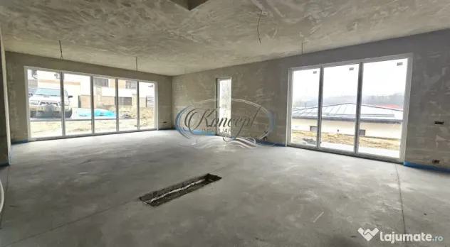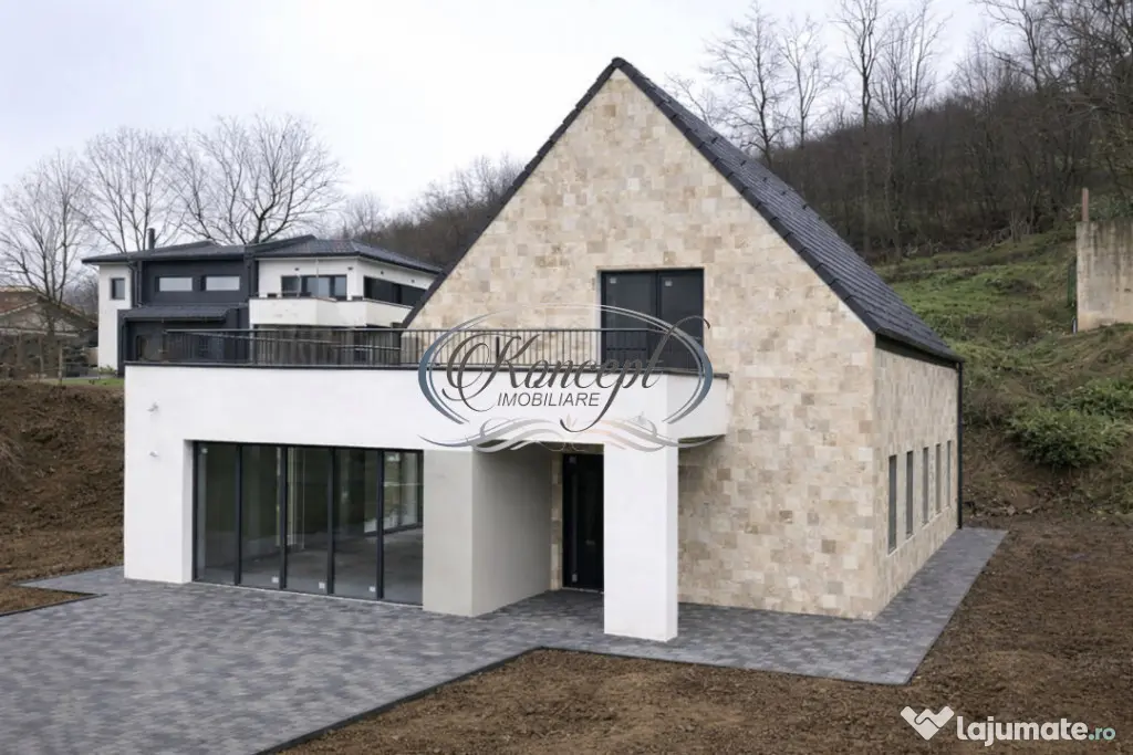 Koncept Imobiliare va ofera spre vanzare o casa individuala situata in Feleacu, intr-o zona retrasa fata de strada principala, caracterizata prin liniste, intimitate si acces facil catre Cluj-Napoca. Proprietatea beneficiaza de o pozitionare excelenta si o panorama frumoasa asupra dealurilor din imprejurimi, fiind amplasata intr-un cadru rezidential nou, cu vecinatati formate din case noi si moderne. Imobilul este dispus pe regim de inaltime P+M si are o suprafata utila de 202 mp, fiind amplasat pe un teren de 800 mp. Compartimentarea este gandita eficient: la parter regasim un living spatios cu bucatarie si loc de luat masa open-space, cu posibilitate de delimitare, un dormitor cu baie proprie si dressing, ideal pentru oaspeti sau pentru un membru al familiei, un birou(sau camera suplimentara), o baie si o camera tehnica. La etaj se afla zona de noapte, compusa din 3 dormitoare, fiecare cu baie proprie (dormitorul matrimonial beneficiaza si de un dressing), si o terasa de 52 mp, perfecta pentru relaxare. Casa se vinde finisata la exterior si semifinisata la interior, oferind libertate totala de personalizare. Interiorul este pregatit cu pereti tencuiti si gletuiti, sape turnate si instalatii electrice si termice trase pe pozitie. Constructia este realizata din caramida, iar confortul termic este asigurat de centrala termica proprie si incalzire prin pardoseala. Exteriorul este complet amenajat, cu izolatie, tencuiala decorativa si piatra naturala, pavaj pentru 2-3 masini, gazon si sistem de irigare automatizat. Casa se remarca prin suprafata generoasa, arhitectura moderna cu suprafete vitrate ample, calitatea constructiei si amplasamentul retras, dar usor accesibil. Este ideala pentru o familie care isi doreste confort, spatiu si liniste, dar si pentru cei care cauta o investitie intr-o zona in plina dezvoltare, cu potential ridicat de apreciere.