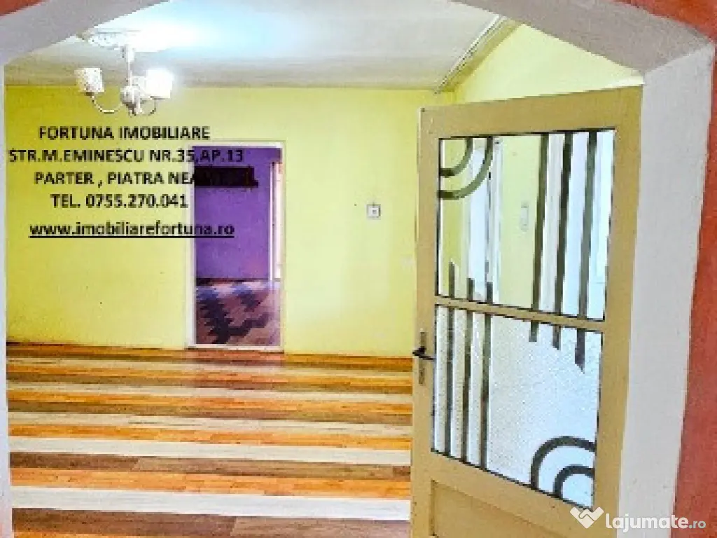 Pentru o prezentare detaliată a acestei oferte, furnizarea unor informații suplimentare referitoare la situația juridică / identificarea imobilului și programarea unei vizionări, vă invităm la sediul nostru, Fortuna Imobiliare, situat pe str. M. Eminescu, nr. 35, ap. 13, parter, lângă fostul Tribunal, tel. contact 0755.270.041.