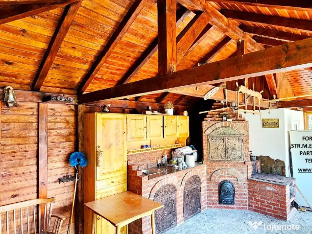 Foișor mare, construit din lemn pe fundații din beton, acoperit cu tablă profilata tip Lindab, prevăzut cu panou solar pentru încălzirea apei, uși culisante din termopan, baie, plită, grup barbeque echipat complet (grătar, afumătoare, plită, chiuvetă, spații depozitare / uscare lemne), utilizabil pe tot parcursul anului.
