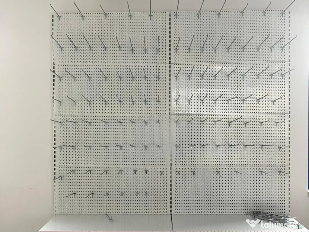 Raft metalic alb-roșu cu spate perforat, dimensiuni 225x95 cm, cu un soclu de 50 cm și un raft de 40 cm. Ideal pentru expunerea produselor în magazine sau spații comerciale.