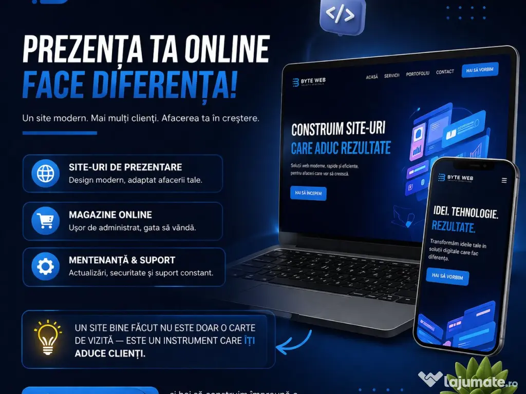 Oferim servicii realizare site de prezentare modern, responsive și optimizat pentru motoarele de căutare. Site-ul va include design personalizat, pagini principale (Acasă, Despre, Servicii/Produse, Portofoliu, Contact), formulare de contact, integrare hartă și optimizare viteză. Ideal pentru IMM-uri, freelanceri și profesioniști care vor să-și crească vizibilitatea online.