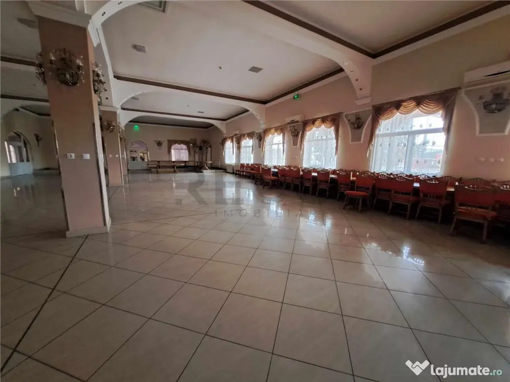 RECO IMOBILIARE VA OFERA SPRE VANZARE: #DM54 Restaurant cu pensiune si sali de evenimente-Afacere la cheie, cu vechime de 35 de ani, care poate functiona inca din prima zi de preluare. Aceasta proprietate este compusa din trei cladiri cu multiple locuri de parcari amenajate. C1: Restaurant-pensiune-trei sali de evenimente: La parter gasim barul, cu prima sala, grup sanitar si bucatarii, de unde se intra in salile de evenimente unde la fel avem grupuri sanitare, locuri de depozitare, terase. La etaj avem un antreu spatios si luminos cu loc de asteptare, hol de acces la cele 10 camere, toate cu grup sanitar propriu ale pensiunii si loc de depozitare. Dispune de autorizatie ISU pentru o capacitate de 450 de persoane. Toate astea pe o suprafata de 1980 mp. Perimetrul intruneste toate elementele de siguranta impuse de lege si este dotat cu hidranti, detectoare de fum, iesiri de urgenta, monitorizare video si sistem de alarm? etc. C2: Spatiul techic cu centrala termica pe combustibil solid. C3: Casa individuala cu birou, grup sanitar etc. pe o suprafata totala de 127 mp, 107.59 mp util constructie solida P E. Pentru mai multe detalii nu ezitati sa ne sunati! Pret:1.600.000 euro negociabil. Telefon: 0376 443 700 C2:ID: 3827 Suprafaţă totală: 1743 m² An finalizare construcție: 2000 Vitrină: 10 m Stadiu construcţie: Finalizat Înălţime spaţiu: 3 m Număr încăperi: 16 Număr Grupuri Sanitare: 20 Comision cumpărător: 0% Tip imobil: Centru comercial