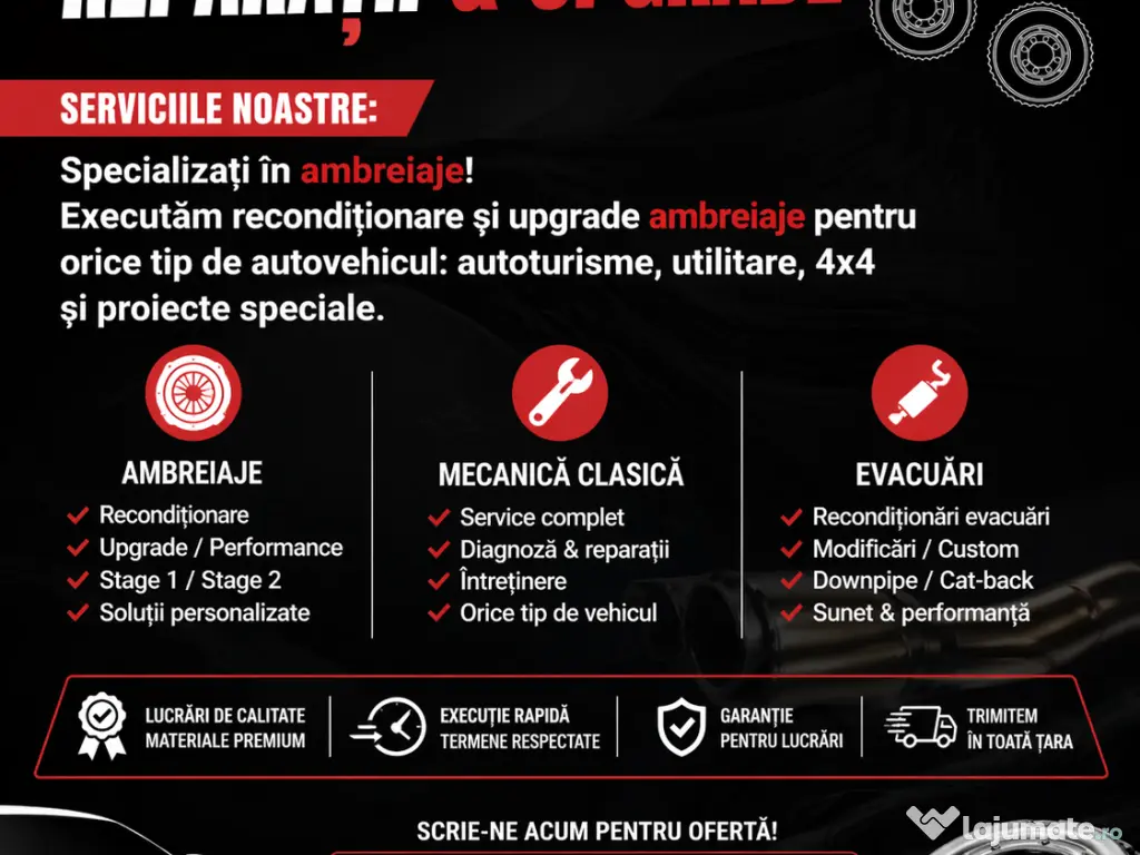 Executăm recondiționare și upgrade ambreiaje pentru orice tip de autovehicul: autoturisme, utilitare, 4x4 și proiecte speciale.