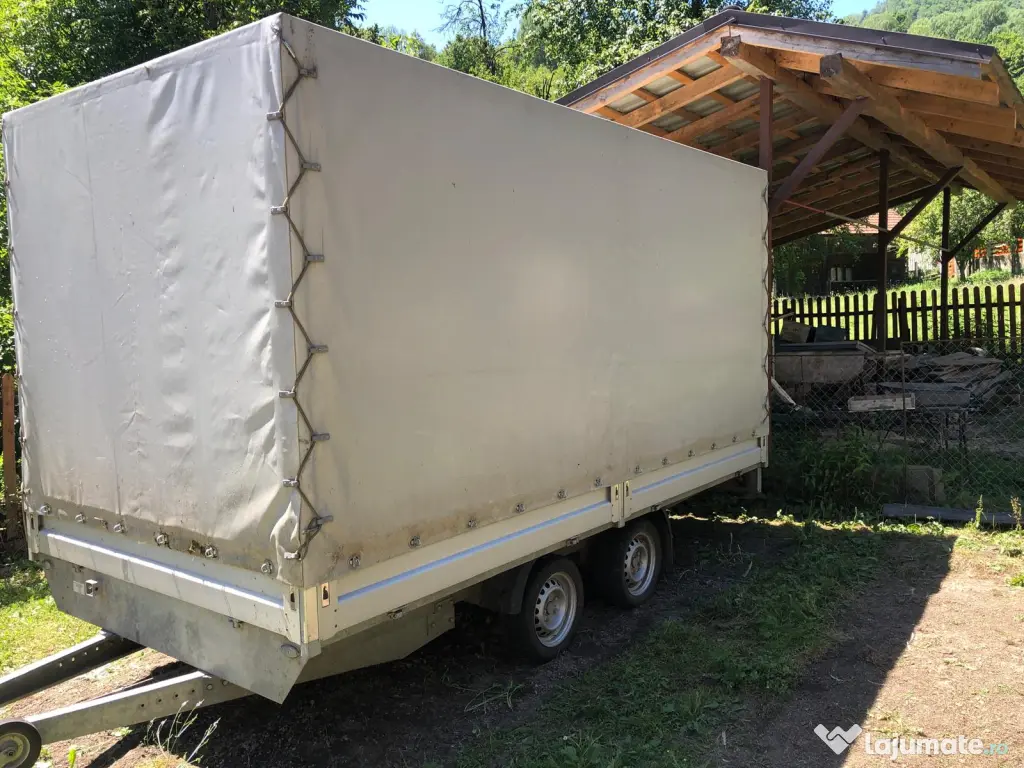 Vând remorcă auto în stare foarte bună, cu prelată demontabilă și troliu pentru încărcare mașini.