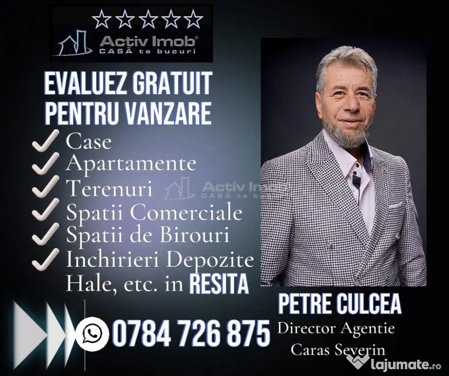 Daca si dumneavoastra aveti o proprietate in Resita sau in Judetul Caras-Severin si doriti sa o vindeti sau inchiriati va rugam sa sunati la numerele de telefon- Petre Culcea: 0784 726 875 si vom crea un profil personalizat pentru vanzarea sau inchirierea acesteia, vizibil pe site-ul oficial de imobiliare al orasului: resita.activimob.ro